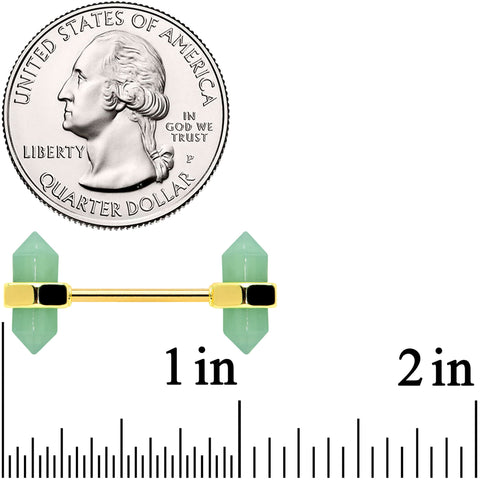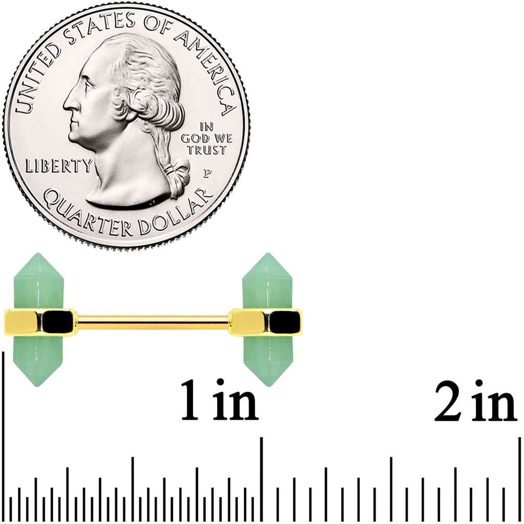 If you're into tie-dye and incense, this 14 gauge nipple jewelry is sure to give you a happier aura! It's made with 16mm gold tone PVD over 316L surgical grade stainless steel straight barbells. Each end features a band holding a vertical green gem, with its classic obelisk shape. While we can't claim they have any magical powers, they will certainly look magical in your nipple piercings! Sold as a set of two.Specifications