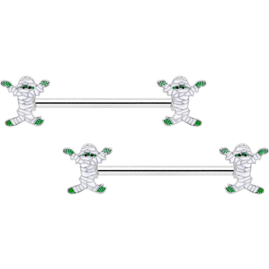 14 Gauge 5/8 Green Mummy Halloween Barbell Nipple Ring Set