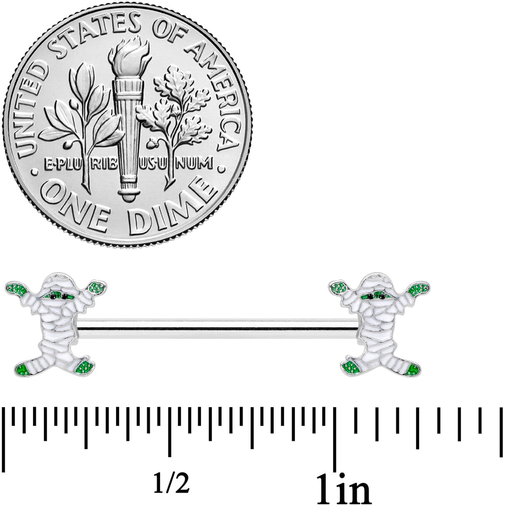 The mummies on this 14 gauge nipple jewelry will have your piercings looking perfect for Halloween! It's made with 16mm durable 316L surgical grade stainless steel straight barbells. Each end features a mummy charm with gruesome green skin and white wrappings, arms spread as though it's ready to grab someone and matching silver tone detailing for a cohesive look! With such creepy detailing, this mummy will have your nipple piercings looking petrifying! Sold as a set of two.Specifications