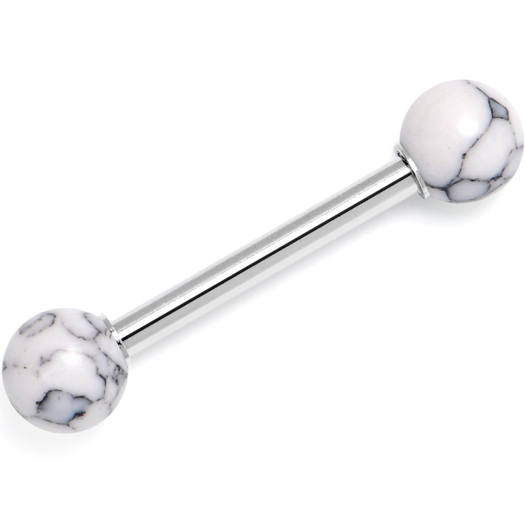 Take the classics and add a shot of glamorous style with this 14 gauge tongue jewelry. It is made with a 16mm durable 316L surgical grade stainless steel straight barbell. It features 5mm natural white howlite stone ball ends, adding a touch of lovely color that is sure to get noticed. Join the band of glam with this elegant tongue piercing jewelry.