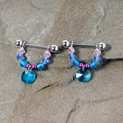 Add a bright splash of color to your nipple piercings with these 14 gauge dangle nipple barbells! They're made with 16mm durable 316L surgical grade stainless steel straight barbells with 5mm ball ends. Suspended between the ends is a strand of gems in shades of blue and pink. At the center of the strand dangles a matching aqua blue gem disc charm, sandwiched between two tiny purple beads. This nipple jewelry is sure to catch the eye as well as the light.......spread some light and color wherever you go! Sold as a set of two.