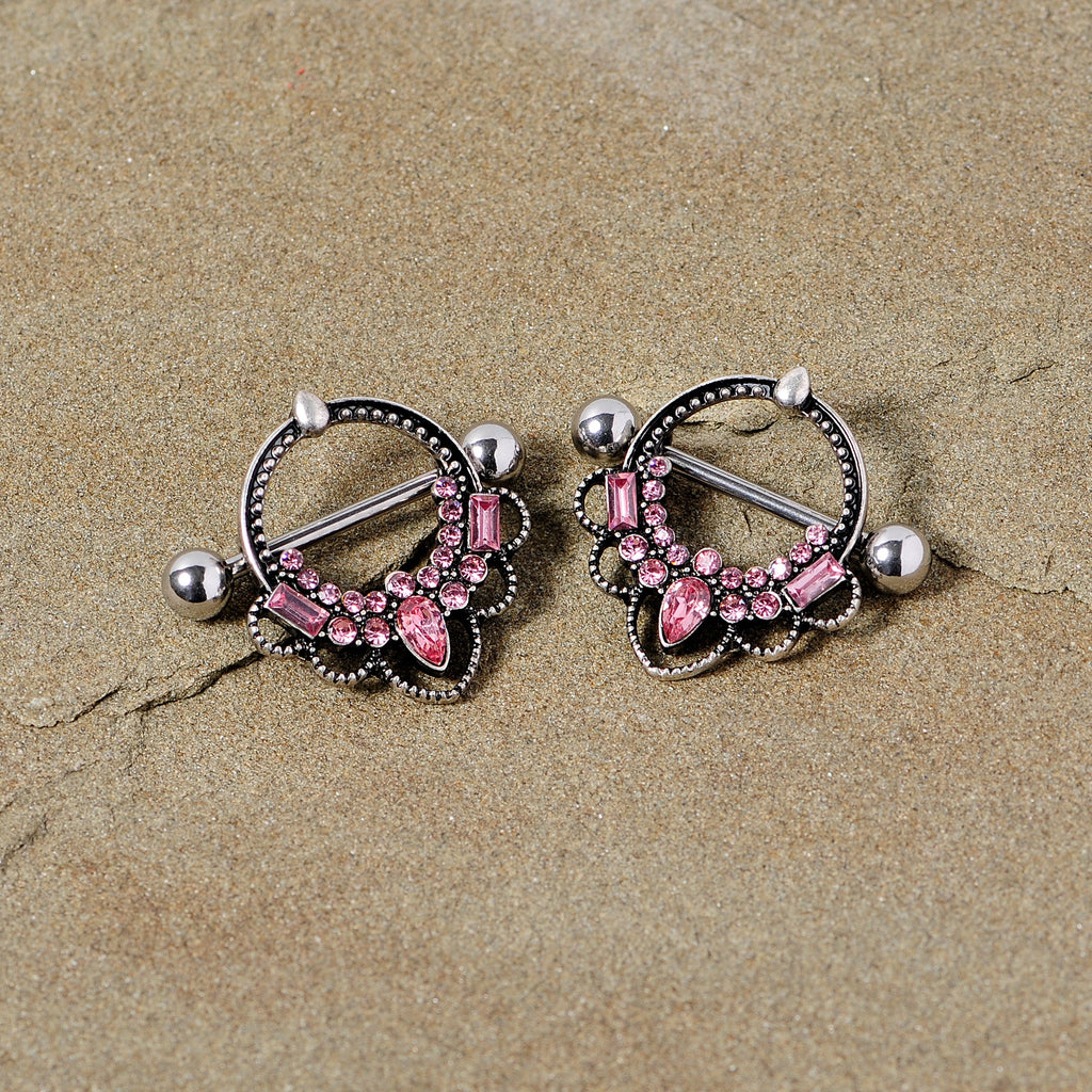 Give your nipple piercings a really rococo look with these lavishly embellished 14 gauge nipple shields! They're made with 16mm durable 316L surgical grade stainless steel barbells with 5mm ball ends. The shield portion features textured detailing all around the edge. The bottom half is richly embellished with pink gems and textured, looping filigree ornamentation. This nipple jewelry is all about the kind of extravagant opulence that will get you (and your piercings!) noticed! Sold as a set of two.