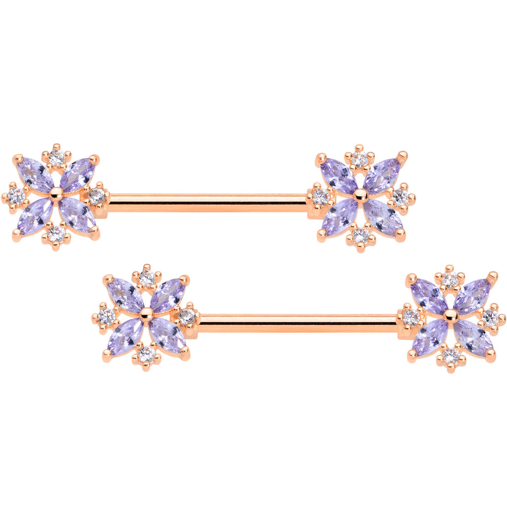 The stars are bursting with style on this 14 gauge nipple jewelry! These nipple piercings are made with 16mm rose gold tone plated over 316L surgical grade stainless steel straight barbells and feature star charm with four points composed of purple cubic zirconia gems, with stars set with clear cubic zirconia gems in between each arm. With such luxurious style, these nipple rings will leave you positively starry-eyed! Sold as a set of two.Specifications