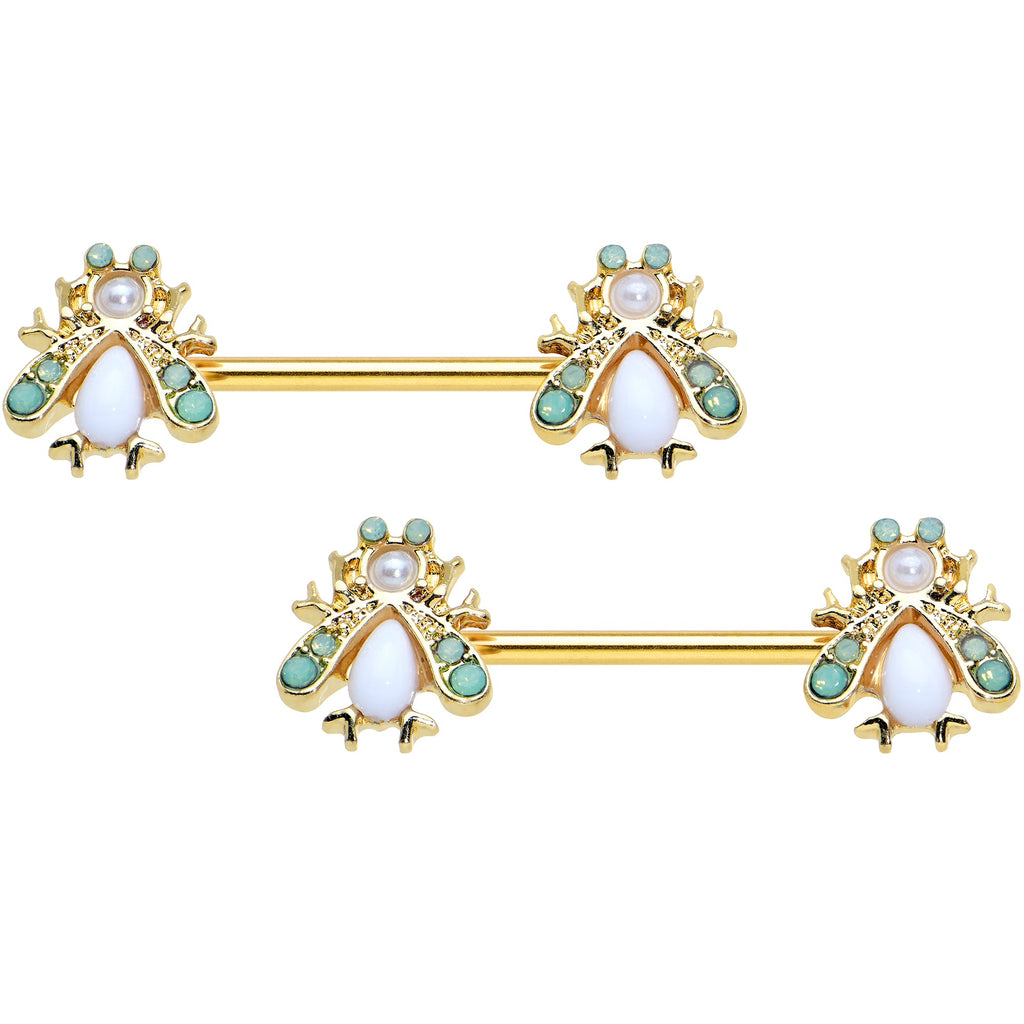 The insects on this 14 gauge nipple piercing rings have tons of wintery style! They're made with 16mm gold tone PVD over 316L surgical grade stainless steel straight barbells. Each of the ends features an insect charm, with white pearlescent orbs for its body and head. Their wings are set with green pearlescent orbs for a colorful and cohesive look. Why let winter bug you when you can rock this elegant insect nipple jewelry! Sold as a set of two.