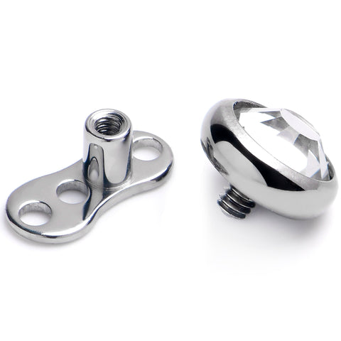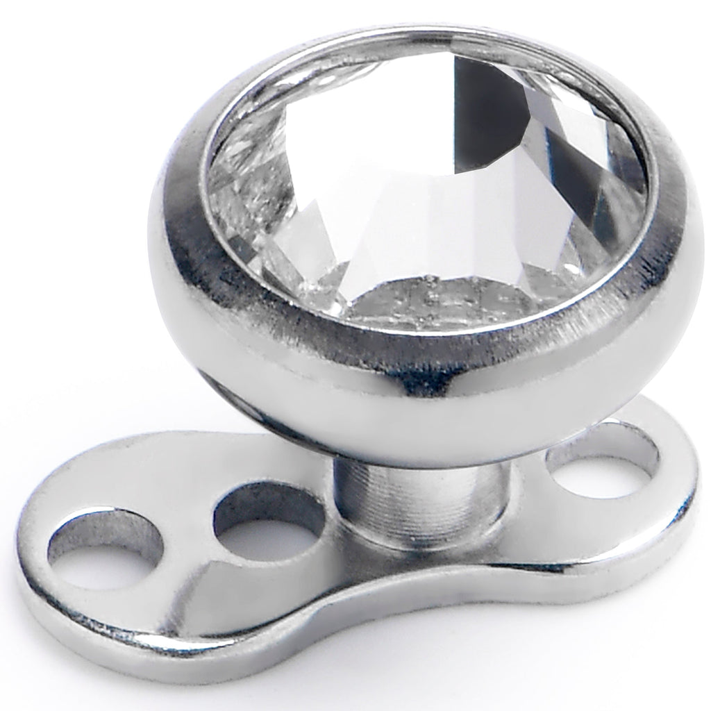This 14 gauge dermal anchor base is made with ASTM F-136 titanium. It features a 2mm rise. It has a triple hole style anchor and an internally threaded post. It also features a 5mm bezel set clear gem top.