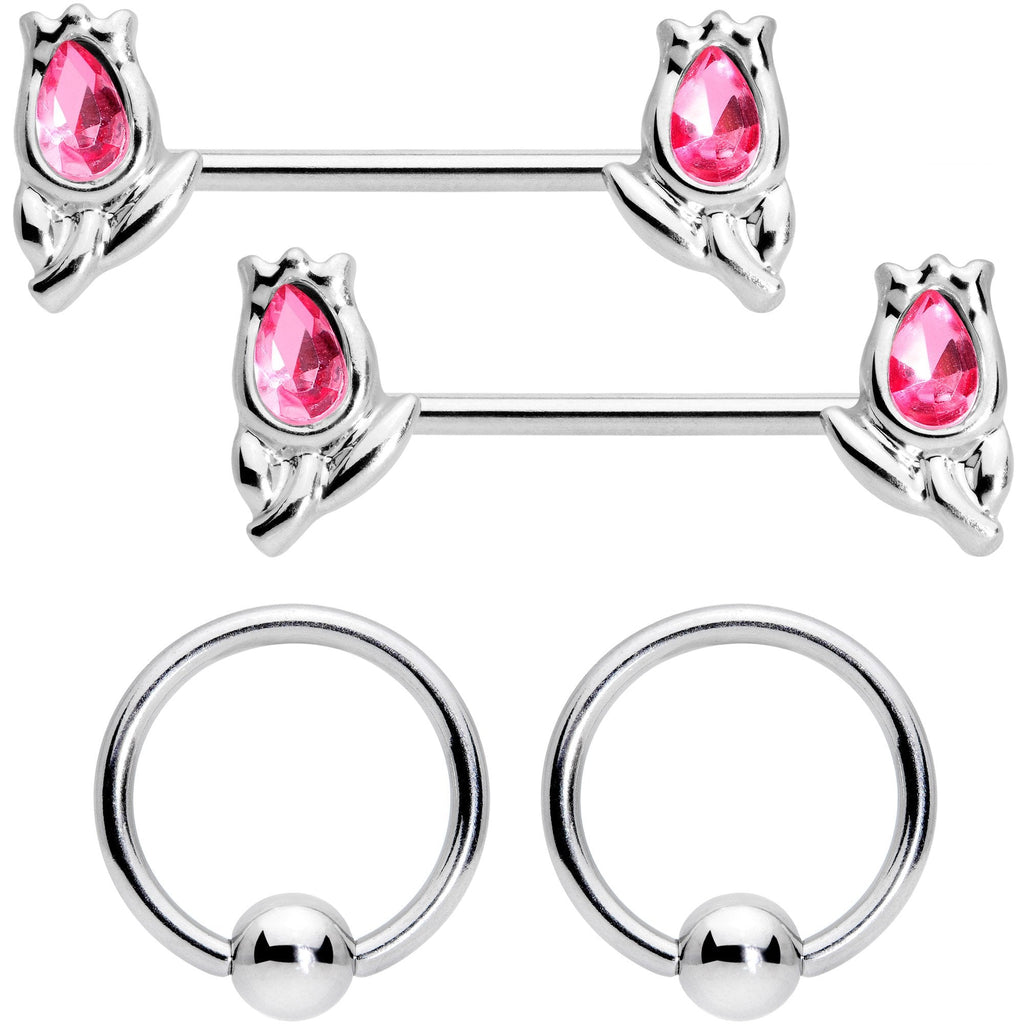Spring is approaching and that means it's time for tulips! This 14 gauge nipple piercing set features a set of 11mm durable 316L surgical grade stainless steel straight barbells. The ends are stylized tulips, with a curved shape and set with pink gems that keep their simple beauty from being plain. You also get a set of 12mm durable 316L surgical grade stainless steel captive rings for a look that is timeless and has a classic appeal. Celebrate spring with whichever look suits your fancy - this set of nipple jewelry has you covered! Sold as a set of four.