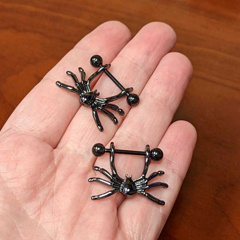 The spiders on this 14 gauge nipple jewelry are hardly eensy weensy! It's made with 11mm wearable length black PVD over 316L surgical grade stainless steel straight barbells with 5mm ball ends. The shield portions feature matching black spider charms, with individually defined legs and textured detailing. These amazing arachnids will help you spin a web of sexy style when you're rocking them in your nipple piercings! Sold as a set of two.Specifications