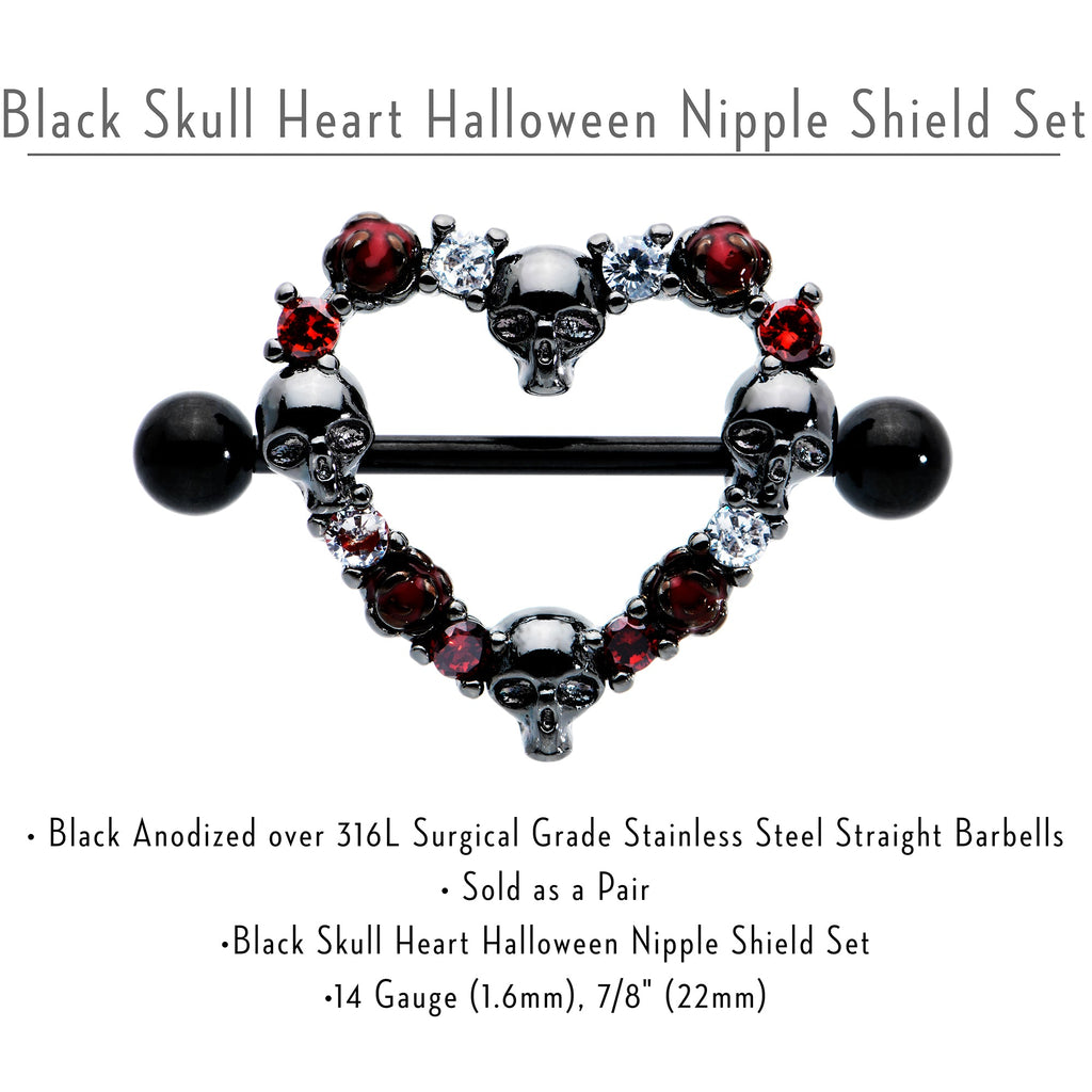 14G 7/8 Red CZ Gem Black Skull Heart Halloween Nipple Shield Set