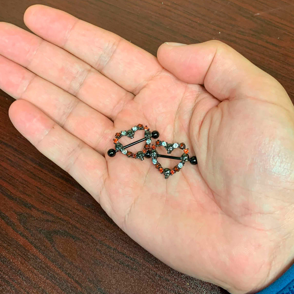 If skulls and all things creepy make your heart beat faster, this 14 gauge nipple jewelry is for you! It's made with 22mm wearable length black anodized over 316L surgical grade stainless steel straight barbells with 5mm ball ends. The shield portions each features a heart shape, in matching black for a cohesive look. The hearts are composed of alternating black skulls and red cubic zirconia gems for a look that's sure catch everyone's eye! For Halloween or all year long, add some gothic glamour to your nipple piercings with this frighteningly fashionable nipple jewelry! Sold as a set of two.