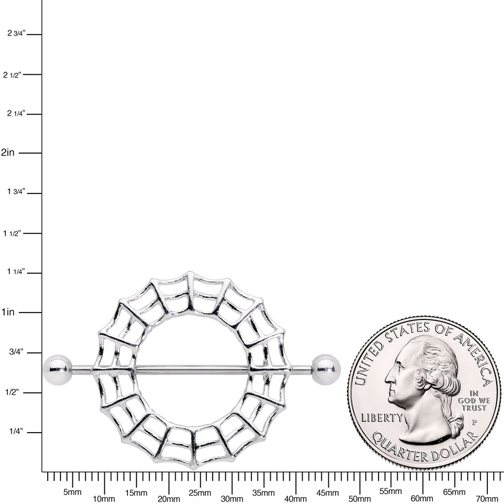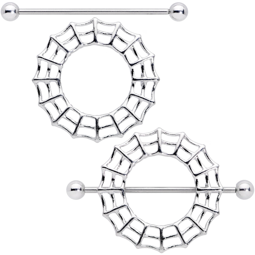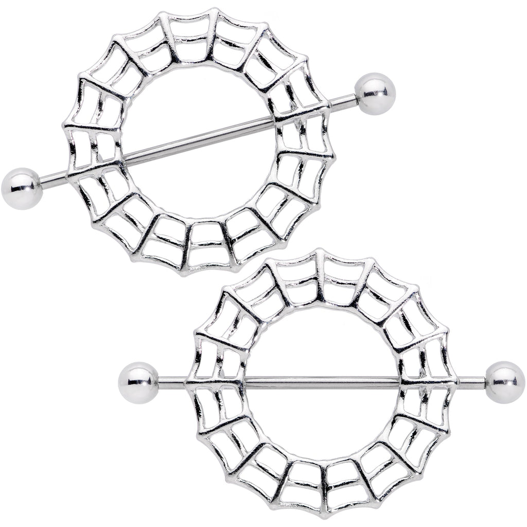 Spin a web of sexy style with this scary 14 gauge nipple jewelry with Halloween style! It's made with 22mm wearable length 316L surgical grade stainless steel straight barbell with 5mm ball ends. The barbells have a total length of 1 1/2". The shield portion features a spider web design, done in an openwork style for an airy and realistic appearance. Whether you're all about arachnids or into spooky style, these nipple shields are sure to catch you in their web! Sold as a set of two.Specifications