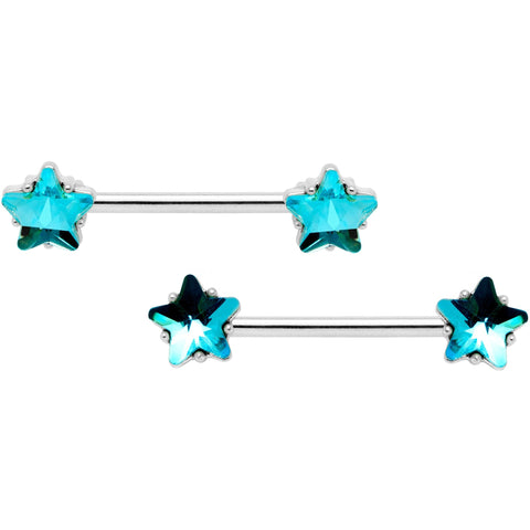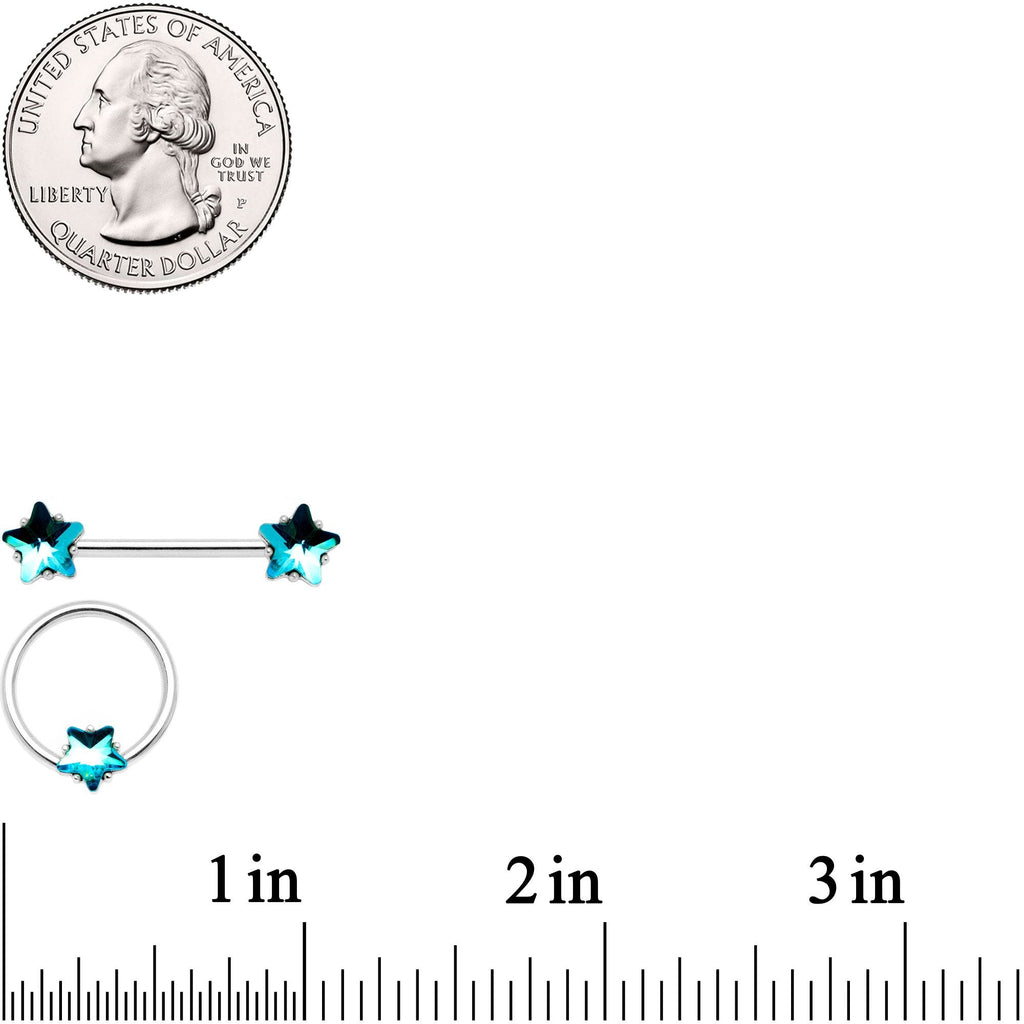 This set of 14 gauge nipple jewelry will have you starry-eyed! It contains a pair of 14mm durable 316L surgical grade stainless steel straight barbells tipped with stunning blue gems shaped like stars. It also includes a pair of 12mm durable 316L surgical grade stainless steel circular rings with the same lovely blue color stars as the captive beads. Now you can watch the stars come out at any time of day, in any style you like. It's up to you! Sold as a set of four.Specifications