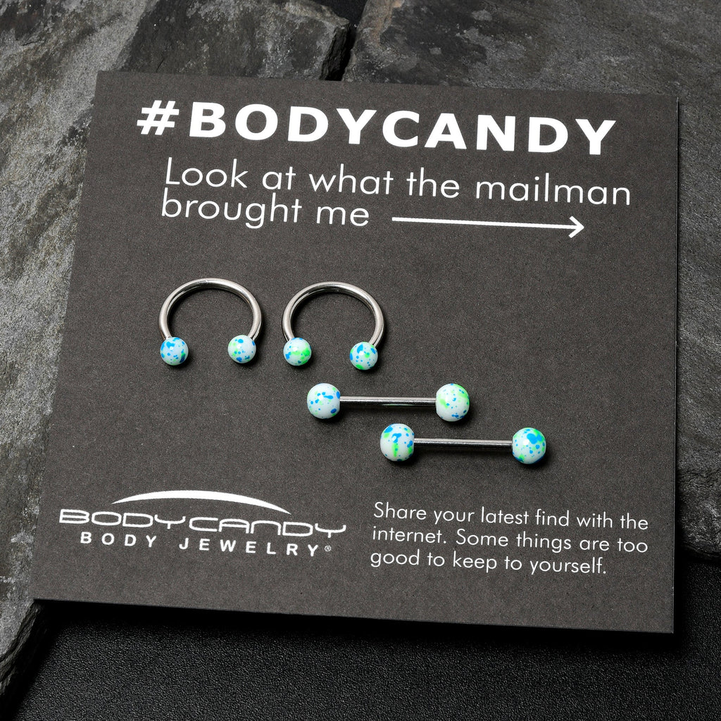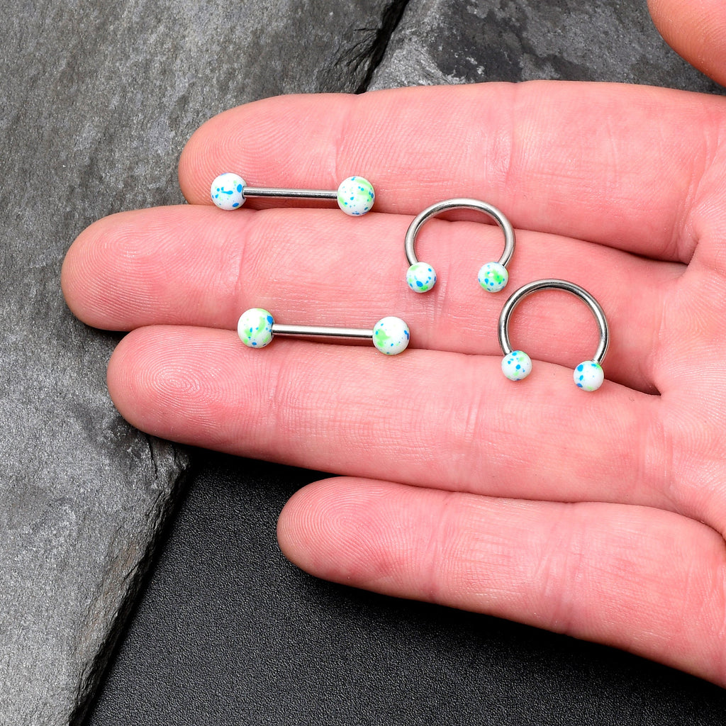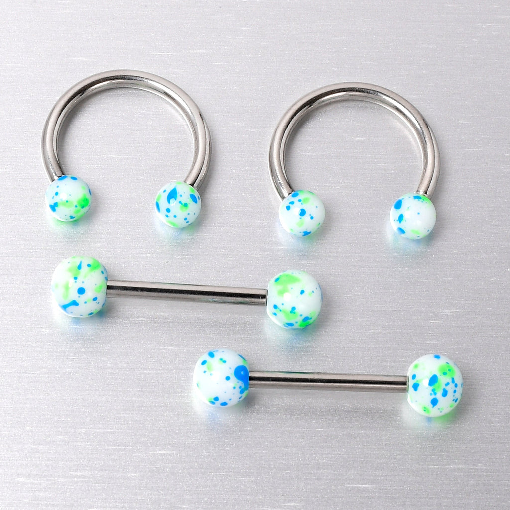 This 14 gauge nipple jewelry will keep you covered when you really like your piercings to match. You get one pair of 14mm durable 316L surgical grade stainless steel straight barbells. The ball ends are white acrylic with a blue and green splatter pattern. You also get one pair of 12mm durable 316L surgical grade stainless steel circular barbells with matching splatter pattern ball ends. You can even rock them in some larger gauge piercings including helix, daith, and some conch piercings. Whether you mix or match, keep it colorful. Sold as a set of four.