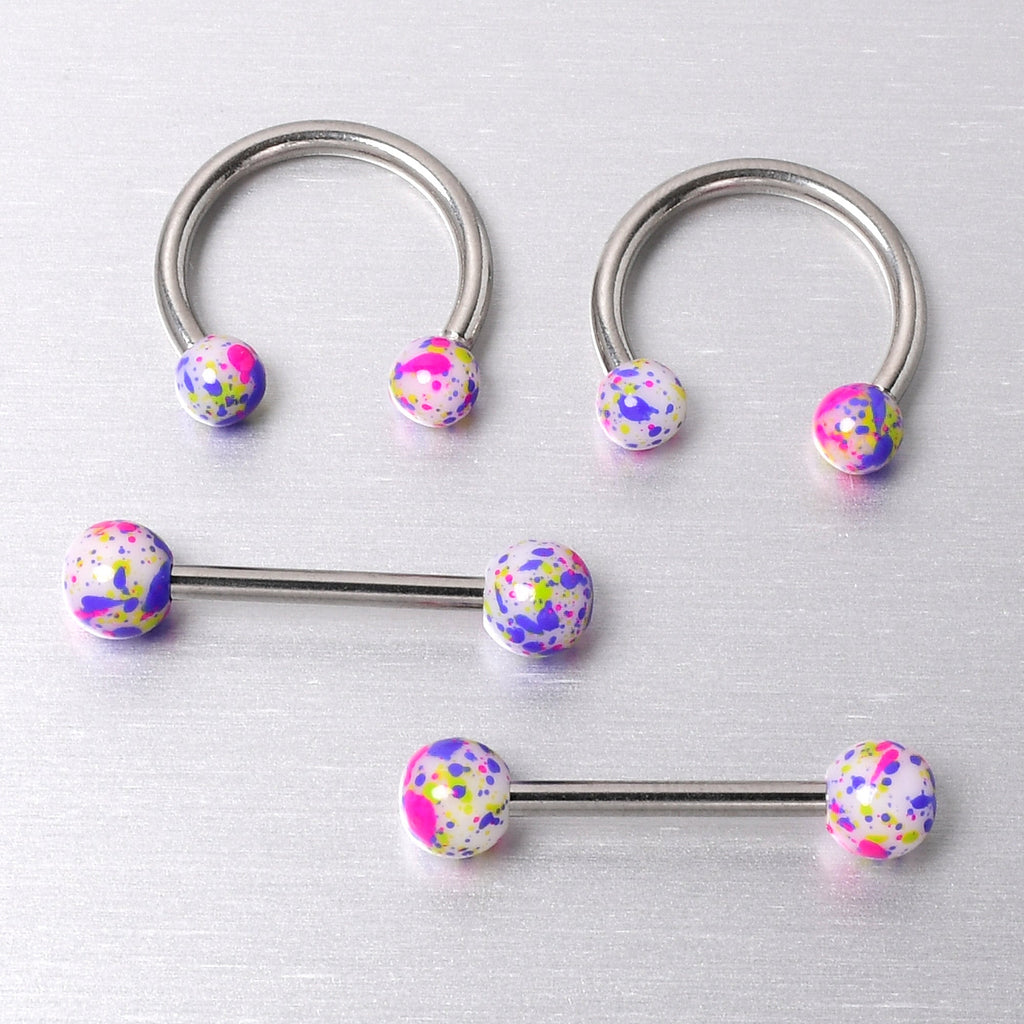 This 14 gauge nipple jewelry will keep you covered when you really like your piercings to match. You get one pair of 14mm durable 316L surgical grade stainless steel straight barbells. The ball ends are white acrylic with a green and purple splatter pattern. You also get one pair of 12mm durable 316L surgical grade stainless steel circular barbells with matching splatter pattern ball ends. You can even rock them in some larger gauge piercings including helix, daith, and some conch piercings. Whether you mix or match, keep it colorful. Sold as a set of four.Specifications