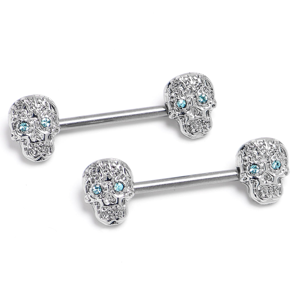 14 Gauge 9/16 316L Steel Skulls Blue Gem with Titanium Barbell Nipple Rings