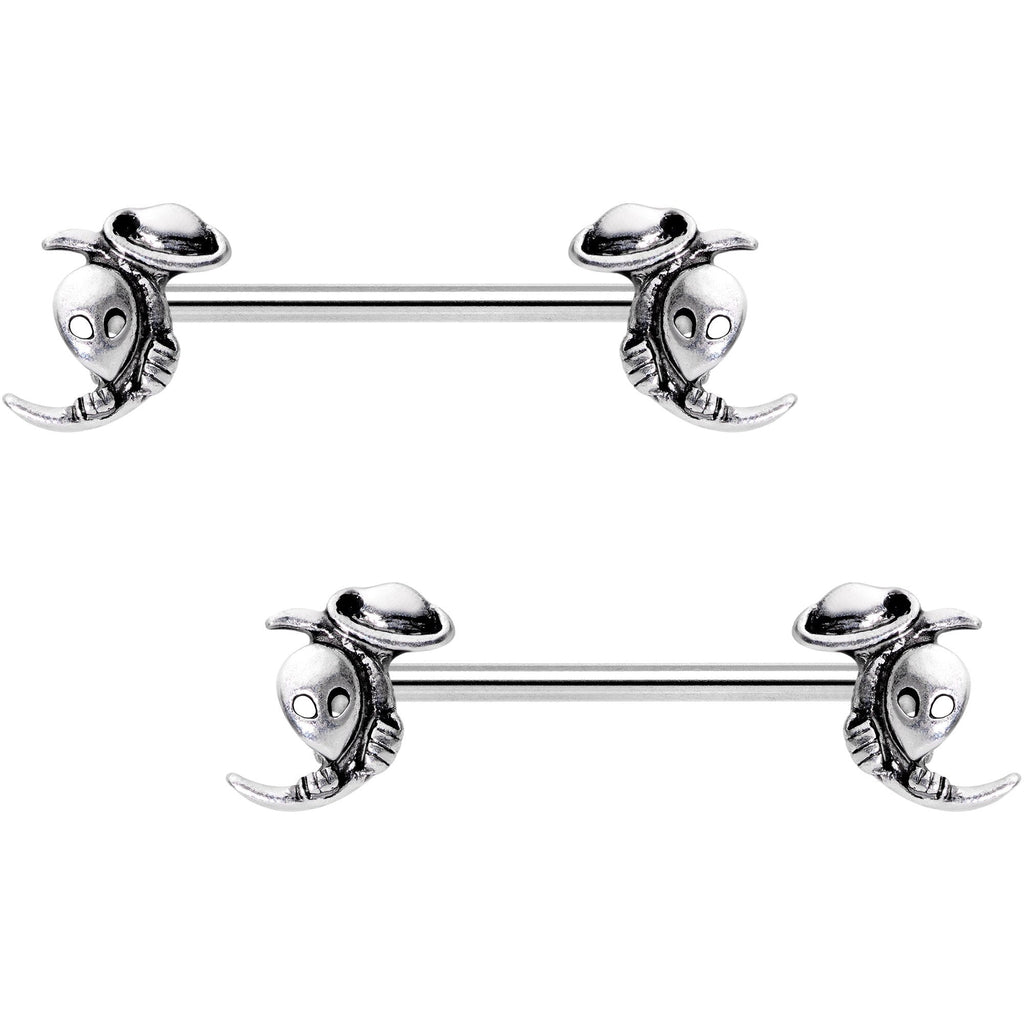 Give your favorite star-gazer something a little more fun to look at when you wear this pair of 14 gauge alien nipple piercings. Made with 14mm durable 316L surgical grade stainless steel straight barbells, this nipple jewelry features crescent moon ends where Mr. Grey aliens and their spaceships have made a crash landing! This set of barbell nipple rings is sold as a set of two.Specifications