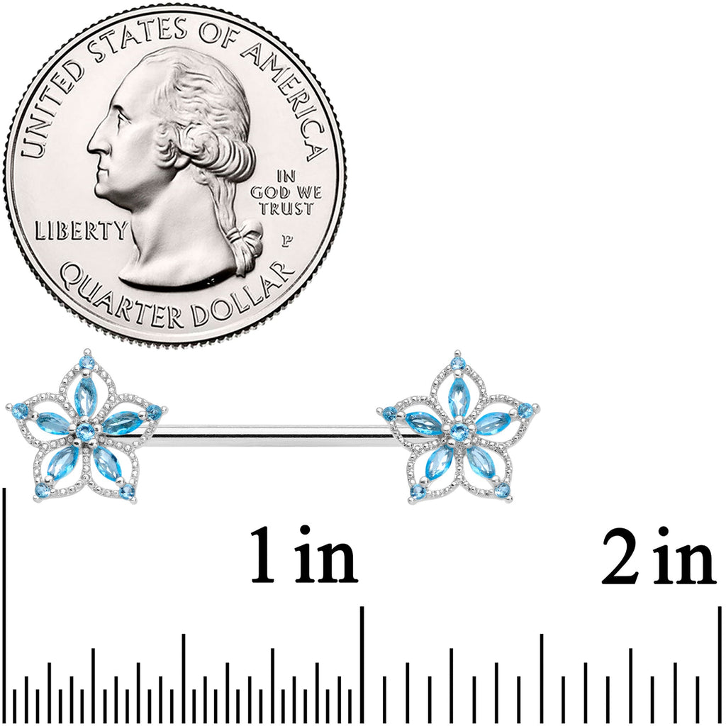 These breezy blossoms are sure to beautify your nipple piercings! This 14 gauge nipple jewelry is made with 14mm durable 316L surgical grade stainless steel straight barbells. The ends each features an openwork flower charm with blue cubic zirconia gems. Let your nipple piercings blossom with this fabulous flower nipple jewelry! Sold as a set of two.Specifications