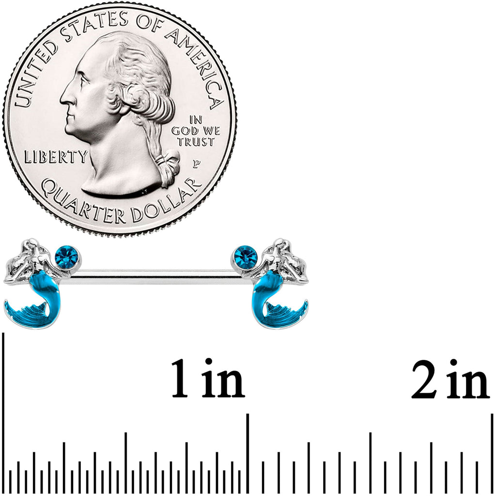 These mermaids have found a treasure that they seem quite fascinated by - like how all eyes will be fascinated by this 14 gauge nipple jewelry! It's made with 14mm durable 316L surgical grade stainless steel straight barbells. Each of the ends features a mermaid charm, gazing intently into an aqua color gem and the edge of her tail in pale blue. This is some nipple piercing jewelry that will be the treasure of your jewelry wardrobe! Sold as a set of two.Specifications