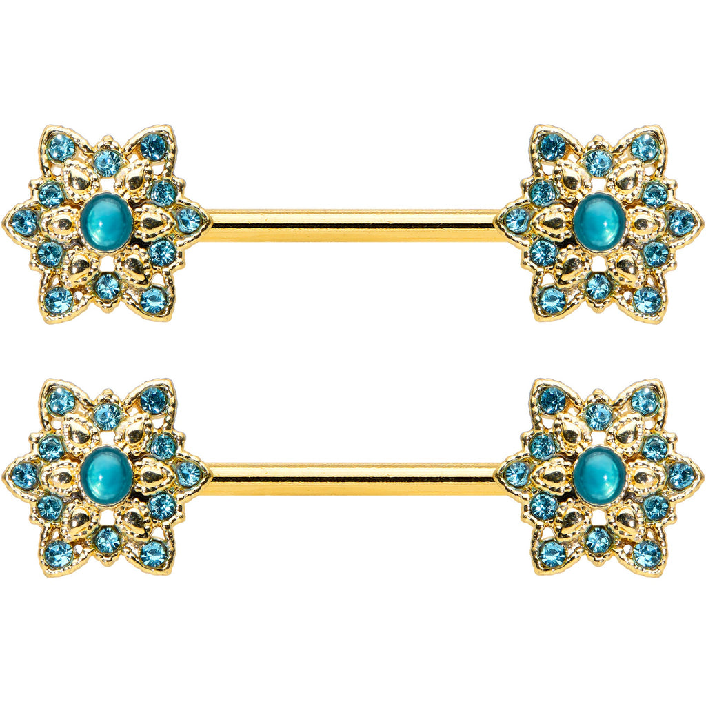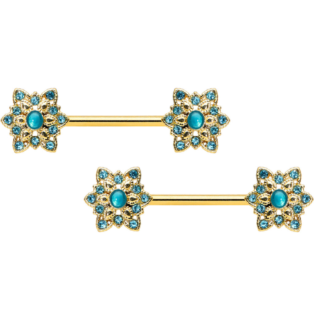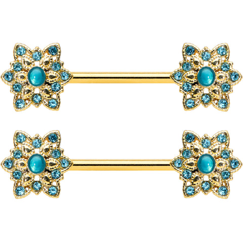 14 Gauge 9/16 Aqua Gem Gold Tone Snowflake Christmas Nipple Ring Set