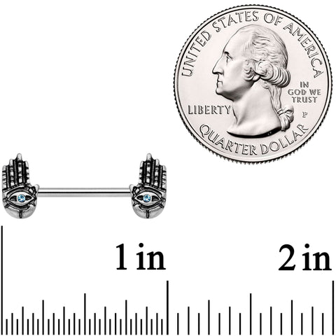 14 Gauge 9/16" Aqua Gem Hamsa Hand Barbell Nipple Ring Set