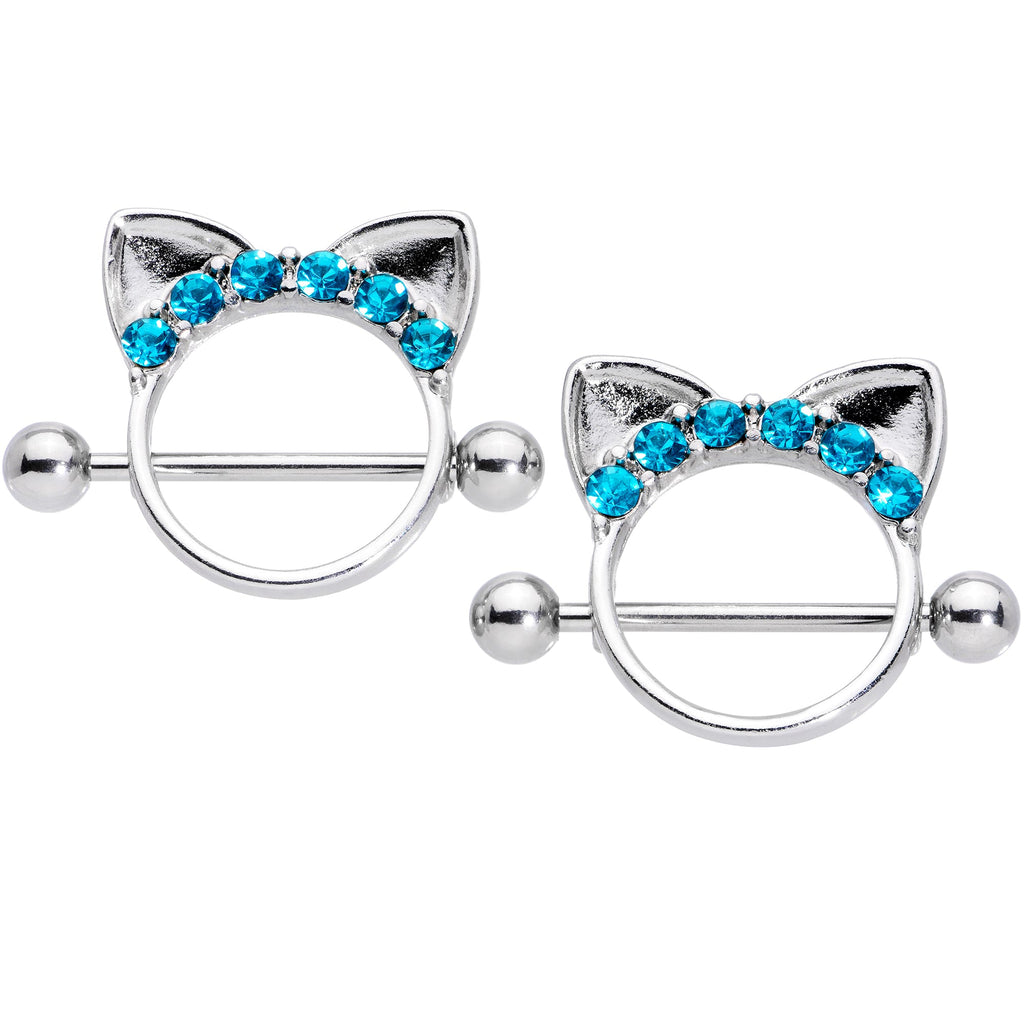 Here's a pair of kitties to make your nipple piercings pretty, on these 14 gauge nipple shields! They're made with 14mm wearable length 316L surgical grade stainless steel straight barbells with 5mm ball ends. The barbells have a total length of 3/4". The shield portion features a fashion-forward feline theme, with cat ears on the top. The ears are embellished with a row of aqua gems for an added touch of glamour that every cool cat and kitten can appreciate! Give your nipple piercings the purr-fect look with this fabulous feline nipple jewelry! Sold as a set of two.Specifications