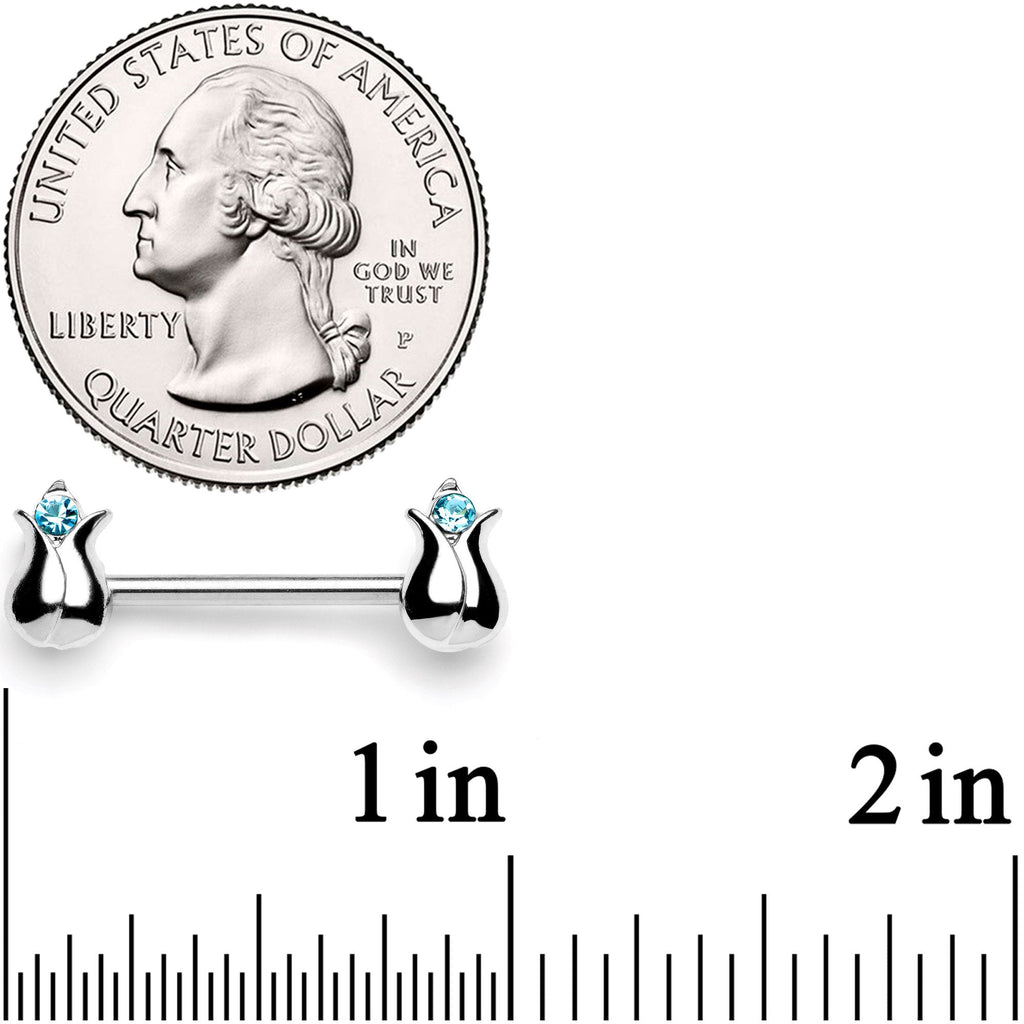 Generally, you have to wait for springtime to enjoy the tulips but now you can enjoy them all year long. Set at their tops with an aqua gem, these nipple piercings are 14 gauge and made with 14mm durable 316L surgical grade stainless steel straight barbells. With these beauties, it's always time for tulips! Sold as a pair.