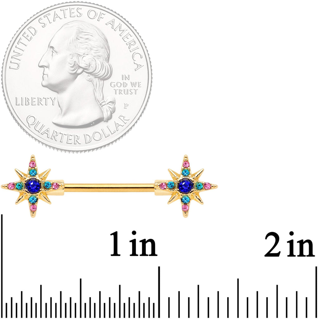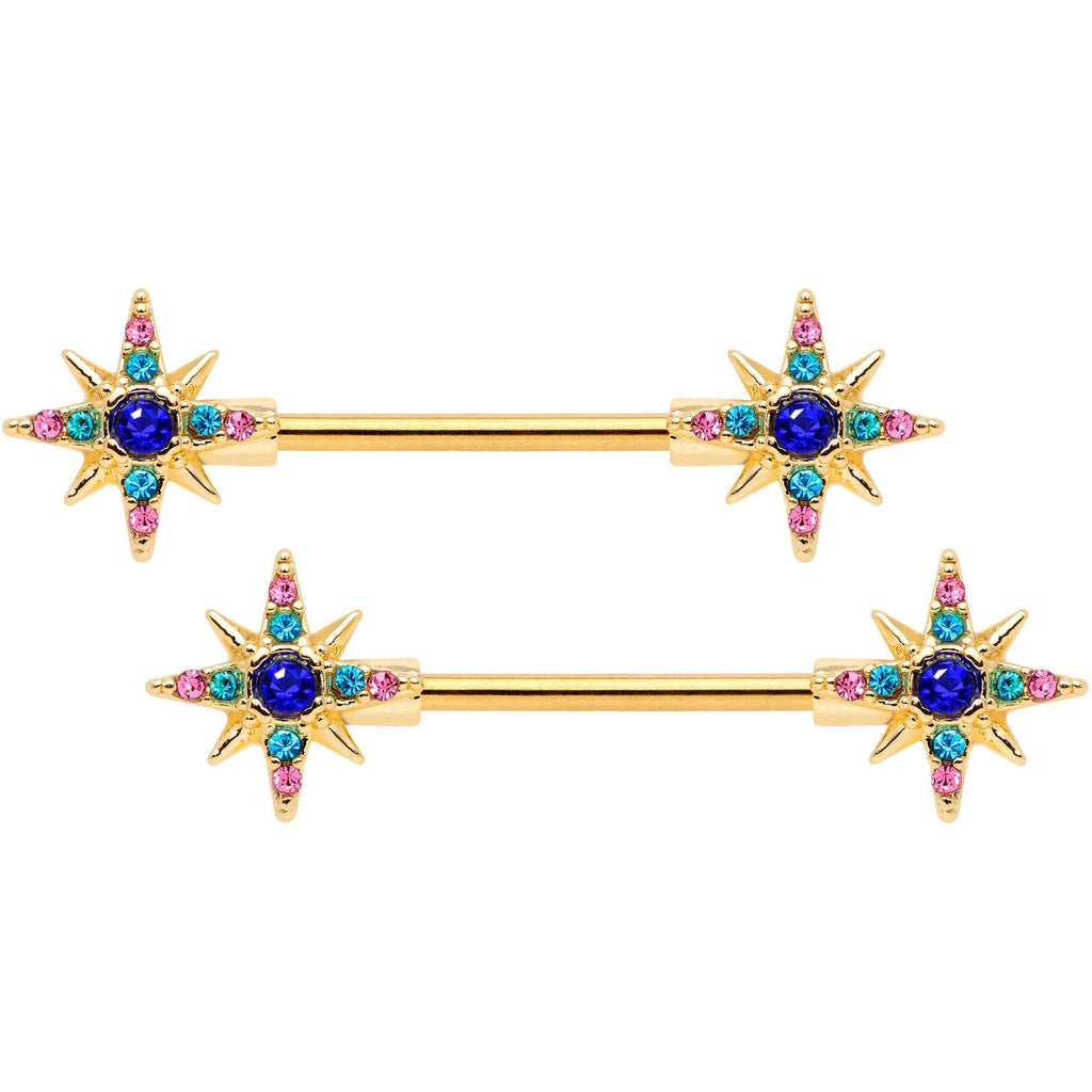 These 14 gauge nipple piercings are going to make you a star! Made with 14mm gold tone PVD over 316L surgical grade stainless steel straight barbells, they feature ends shaped like eight-pointed stars. Each star is set with numerous tiny gems in pink and aqua. At the center of each star is a larger gem in a deep royal blue for a truly regal appearance. You'll love these so much you'll be absolutely starry-eyed! Sold as a set of two.Specifications