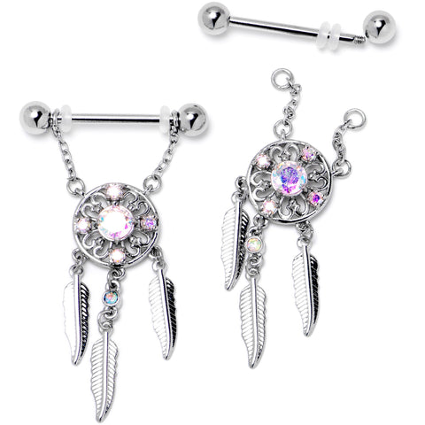 14 Gauge 9/16 Aurora CZ Gem Dreamcatcher Dangle Nipple Ring Set