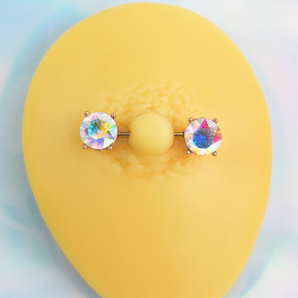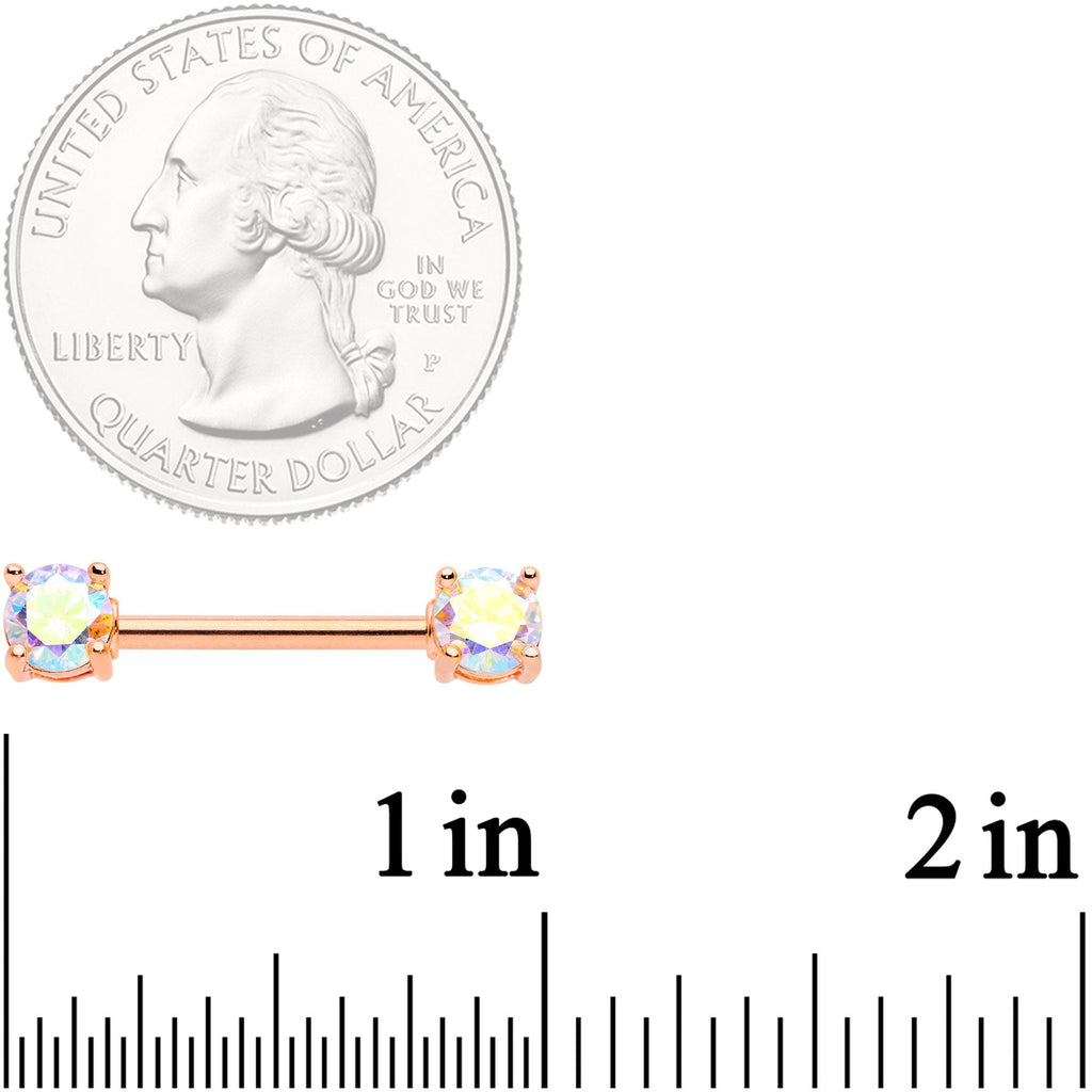 Add some sexy glamour to your 14 gauge nipple piercings! This nipple jewelry set is made with 14mm rose gold tone anodized over 316L surgical grade stainless steel straight barbells. The ends are cubic zirconia gems in our gorgeous aurora color. If you like to keep it simple but still love a look of luxury, these nipple rings are exactly what you're looking for! Sold as a set of two.Specifications