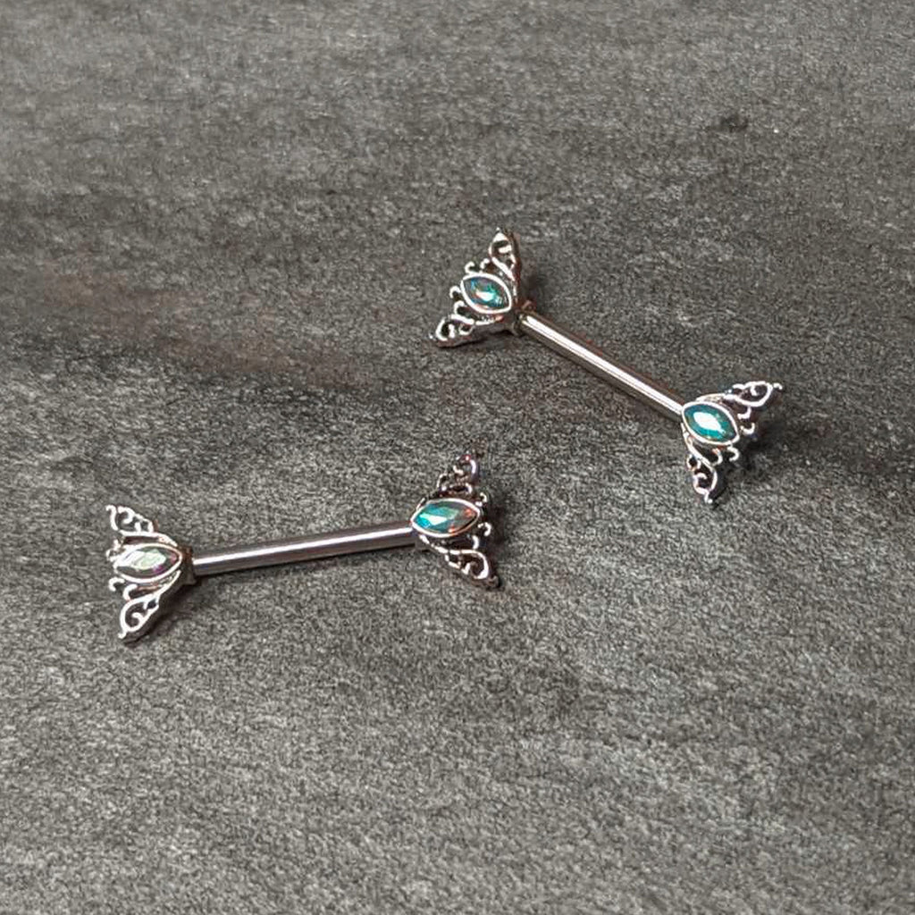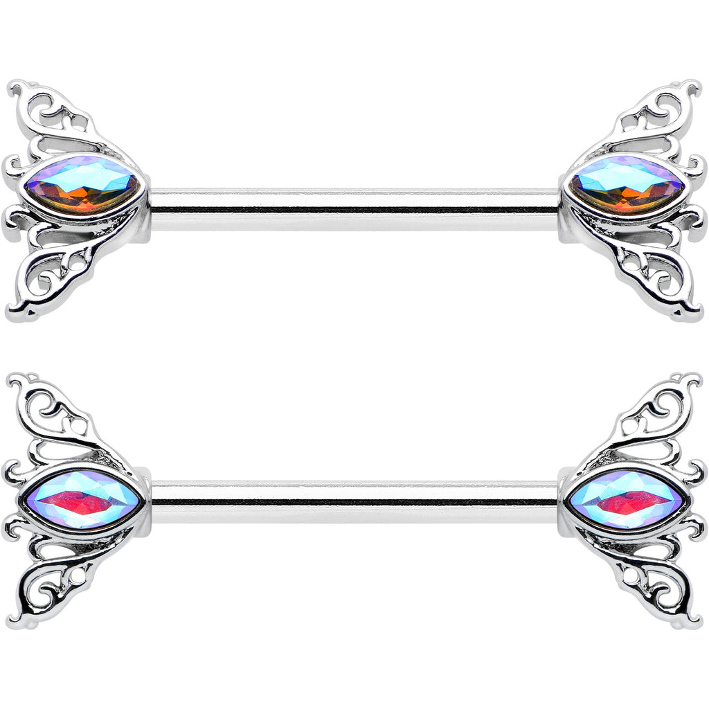 Ride a wave of style with this 14 gauge nipple jewelry! It's made with 14mm durable 316L surgical grade stainless steel straight barbells. Each of the ends features an Art Deco charm of waves and scrolls. Set at each of the centers is an oval shaped aurora gem that adds a classic touch of color and glamour to a timeless look. You'll be waving hello to a whole new look with these sleek and timeless nipple piercing rings. Sold as a set of two.Specifications