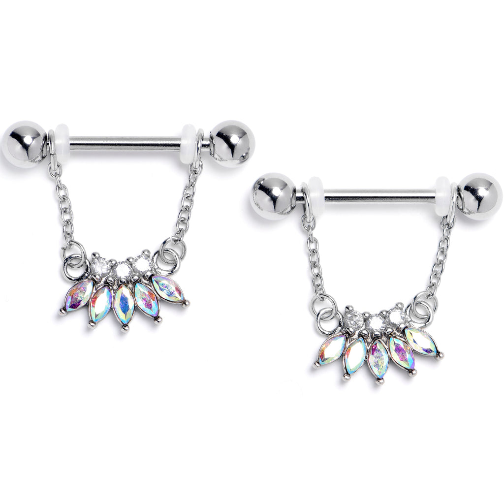 14 Gauge 9/16 Aurora Gem Fashion Fan Chain Dangle Nipple Ring Set