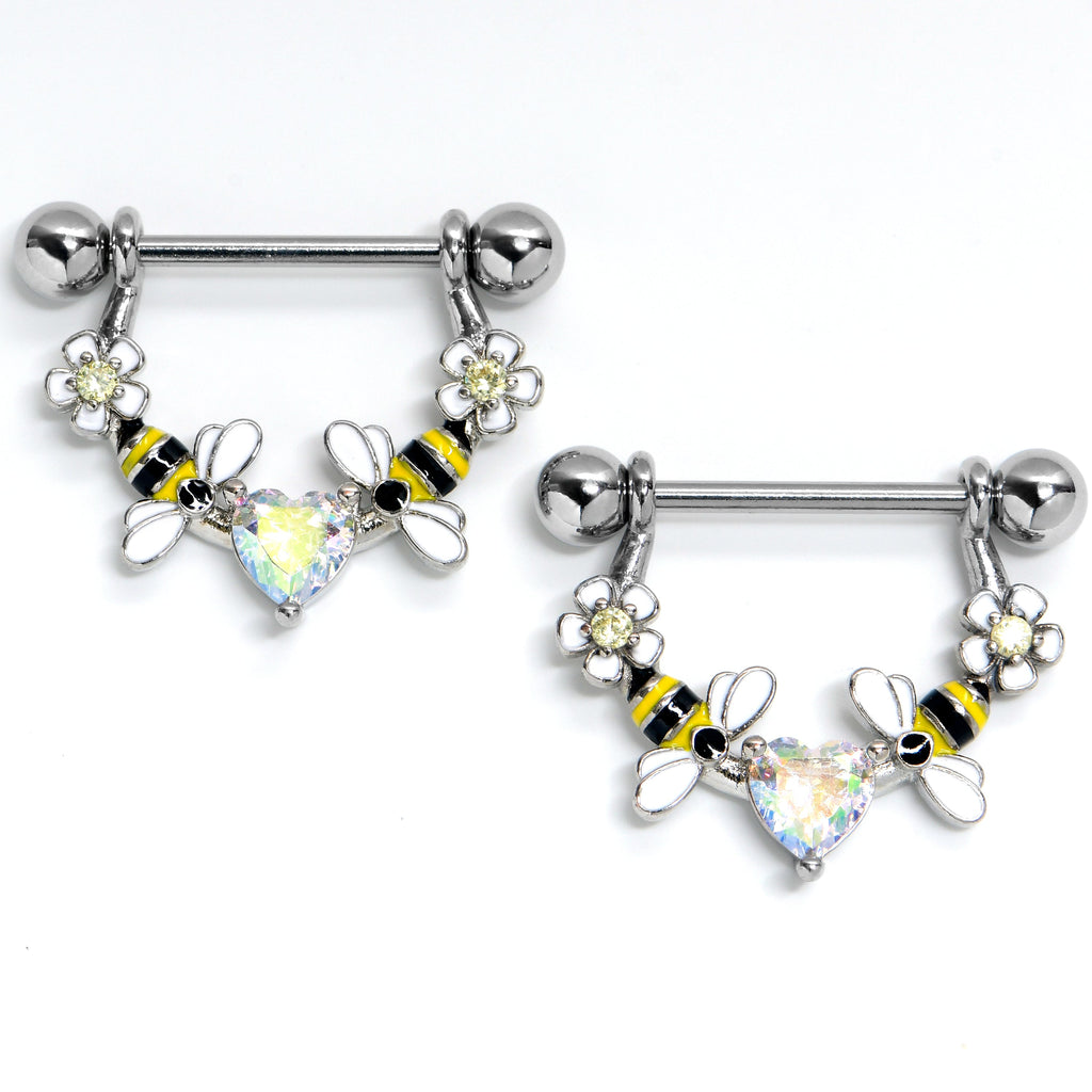 14 Gauge 9/16 Aurora Gem Heart Bees Flowers Dangle Nipple Ring Set
