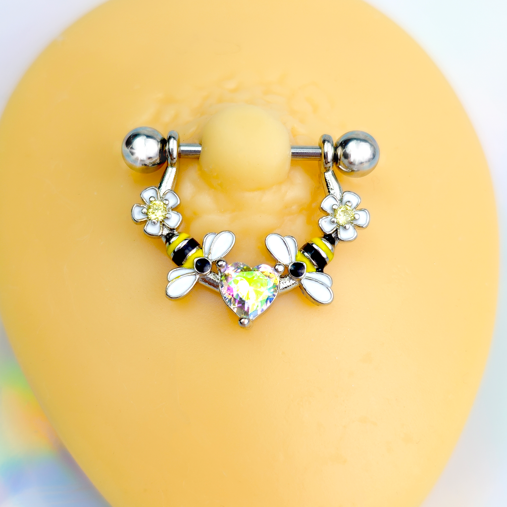 This 14 gauge nipple jewelry will bee sure to steal your heart. It is made with 14mm durable 316L surgical grade stainless steel straight barbells with 5mm ball ends. Dangling from each barbell are a pair of flower charms with aurora gem centers. Next to each flower is a bee charm, with black and yellow stripes, sitting on either side of an aurora gem heart. You will be be the hottest honey in the hive when you are rocking these charmingly cottagecore nipple piercing rings. Sold as a set of two.Specifications