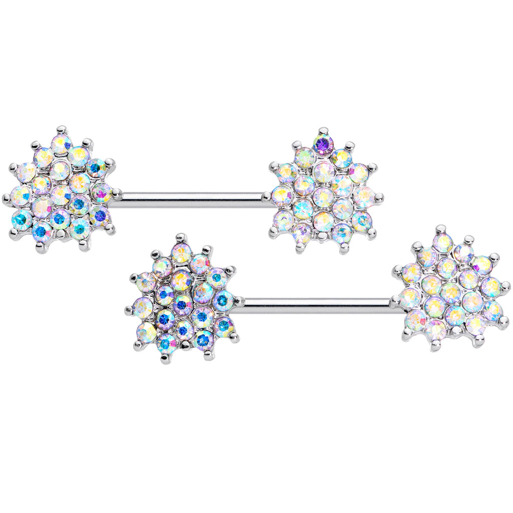 You may need to shield your eyes from the fierce glamour radiating from this 14 gauge nipple jewelry! It's made with 14mm durable 316L surgical grade stainless steel straight barbells. The ends feature large clusters of small aurora gems. The look is both simple and strikingly dramatic, giving a sumptuous look to your nipple piercings that's impossible to ignore. Take glamour to a whole new level with these alluringly opulent nipple rings! Sold as a set of two.Specifications