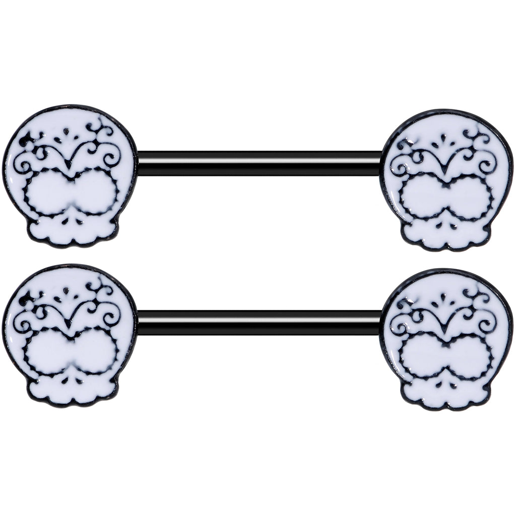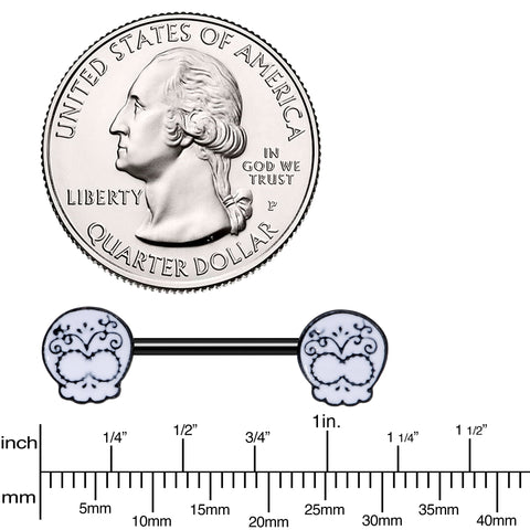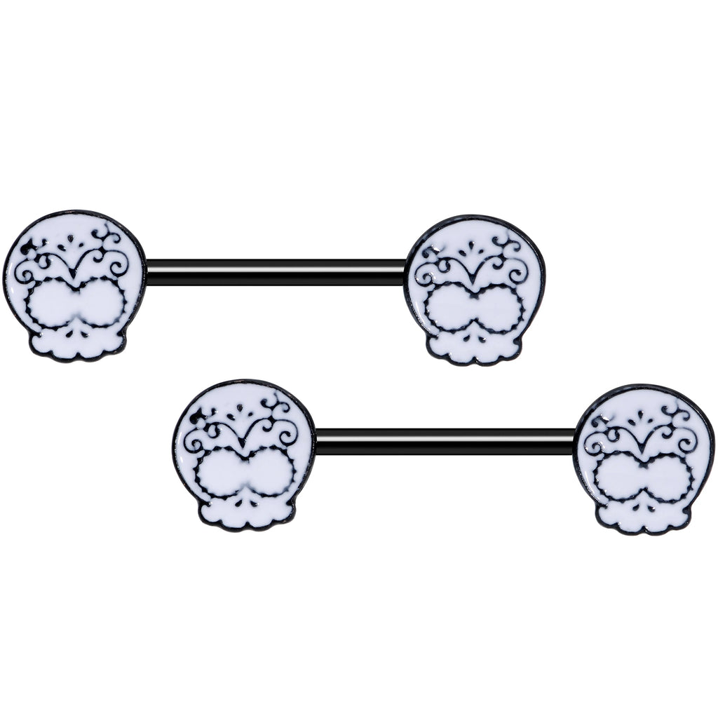 14 Gauge 9/16 Black Calavera Sugar Skull Barbell Nipple Ring Set