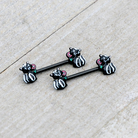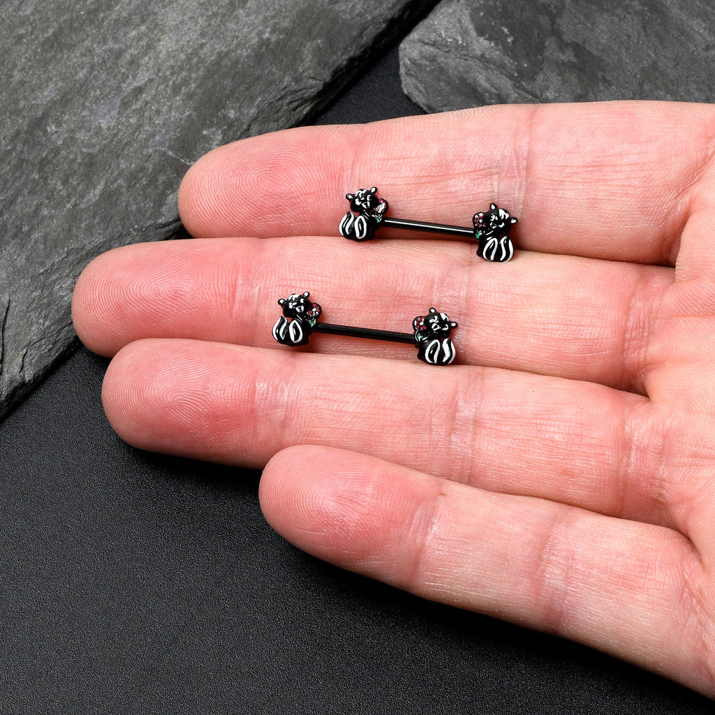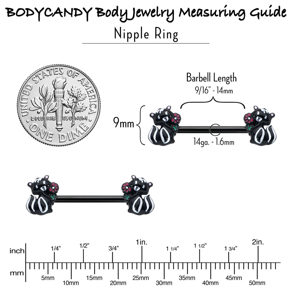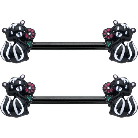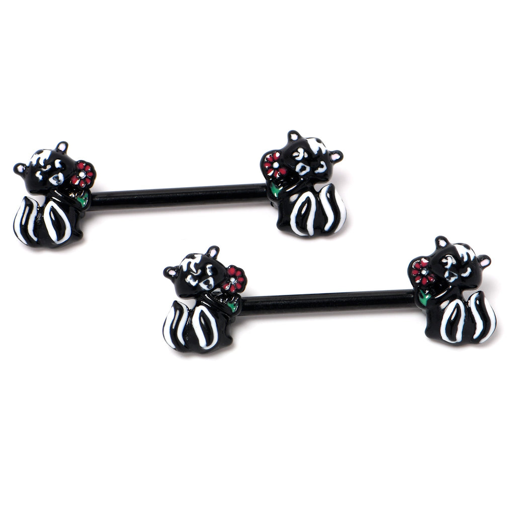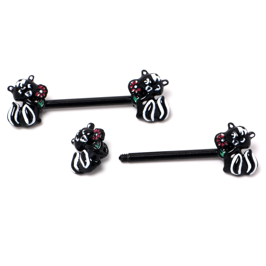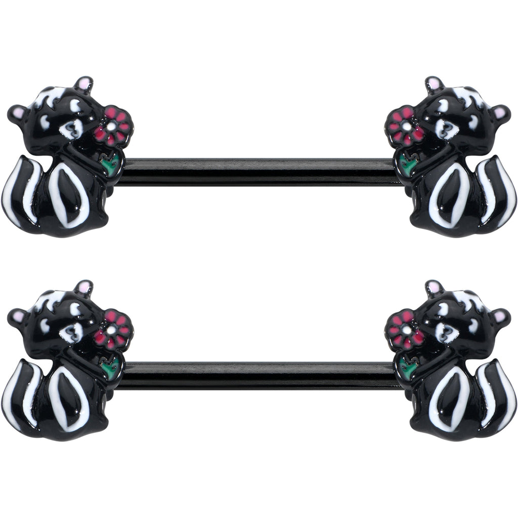Get funky with the skunkies on this 14 gauge nipple jewelry. It is made with 14mm black PVD over 316L surgical grade stainless steel straight barbells. Each of the ends features an adorable skunk charm. The skunks feature black and white inlay and are each clutching a red inlaid flower for an extra sweet appearance. You will fall in love with these little stinkers on these sweetheart skunk nipple piercing rings. Sold as a set of two.Specifications