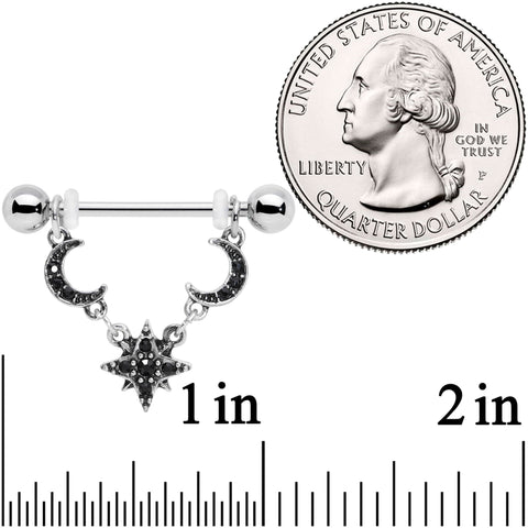 Whether you're a witchy woman or a devoted stargazer, this 14 gauge nipple jewelry is sure to be the biggest star of your collection! It's made with 14mm durable 316L surgical grade stainless steel straight barbells with 5mm ball ends. Dangling from each barbell is an eight-pointed star centered between two crescent moons. All three are lavishly set with black gems for a mysterious, gothic appearance. These nipple rings are sure to cast a spell on you! Sold as a set of two.Specifications