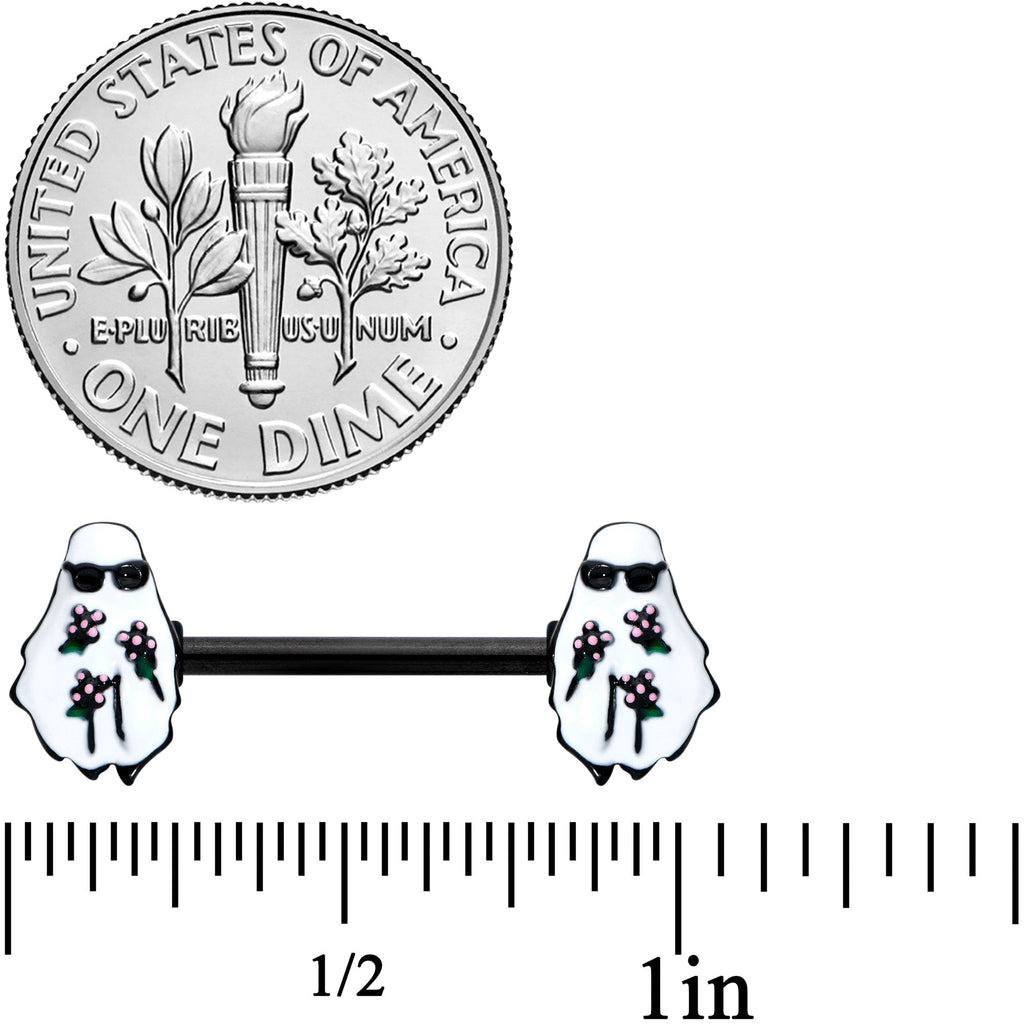 The ghost on this 14 gauge nipple jewelry is oozing with style! It's made with 14mm black PVD over 316L surgical grade stainless steel straight barbells. Each of the ends features a ghost charm, wearing super-cool black shades. The ghosts are also wearing a flowered sheet instead of a plain white one. You'll have the hippest Halloween ever with this stylish ghost nipple piercing jewelry! Sold as a set of two.