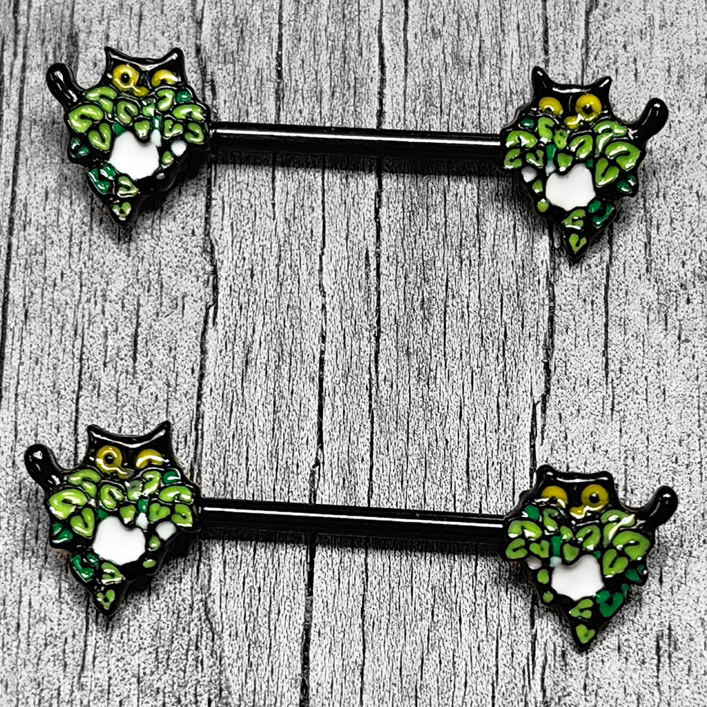 Get ready to pounce on style with this 14 gauge nipple jewelry. It is made with 14mm black PVD over 316L surgical grade stainless steel straight barbells. Each of the ends features a cat charm, with the cats hiding in green inlaid foliage for major contrast. Get feline fabulous with these classic, kitty cat nipple piercing rings. Sold as a set of two.Specifications