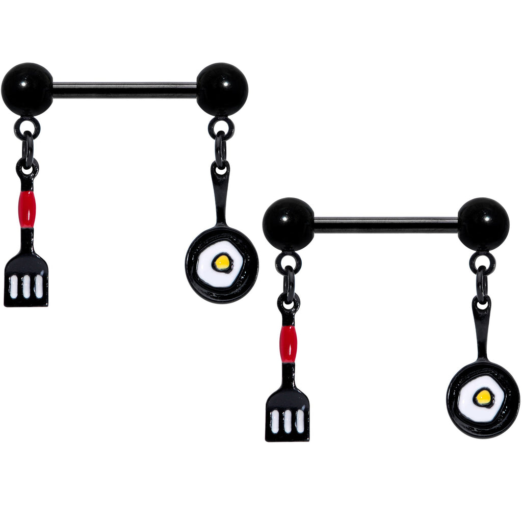 Now the cook can be hotter than the kitchen in this 14 gauge nipple jewelry! It's made with 14mm black PVD over 316L surgical grade stainless steel straight barbells with 5mm ball ends. Dangling from each ball end is a different cooking-themed charm. One side is a spatula charm, with open work detailing for a touch of realism. The other side features a frying pan charm, complete with an egg frying inside! It's a whole new recipe for looking delicious when you're rocking these chef-themed nipple piercing rings! Sold as a set of two.Specifications