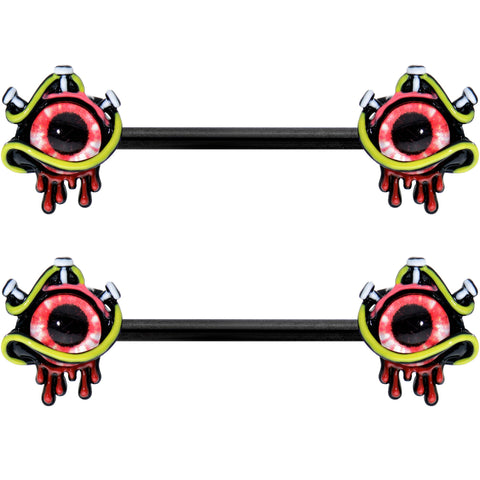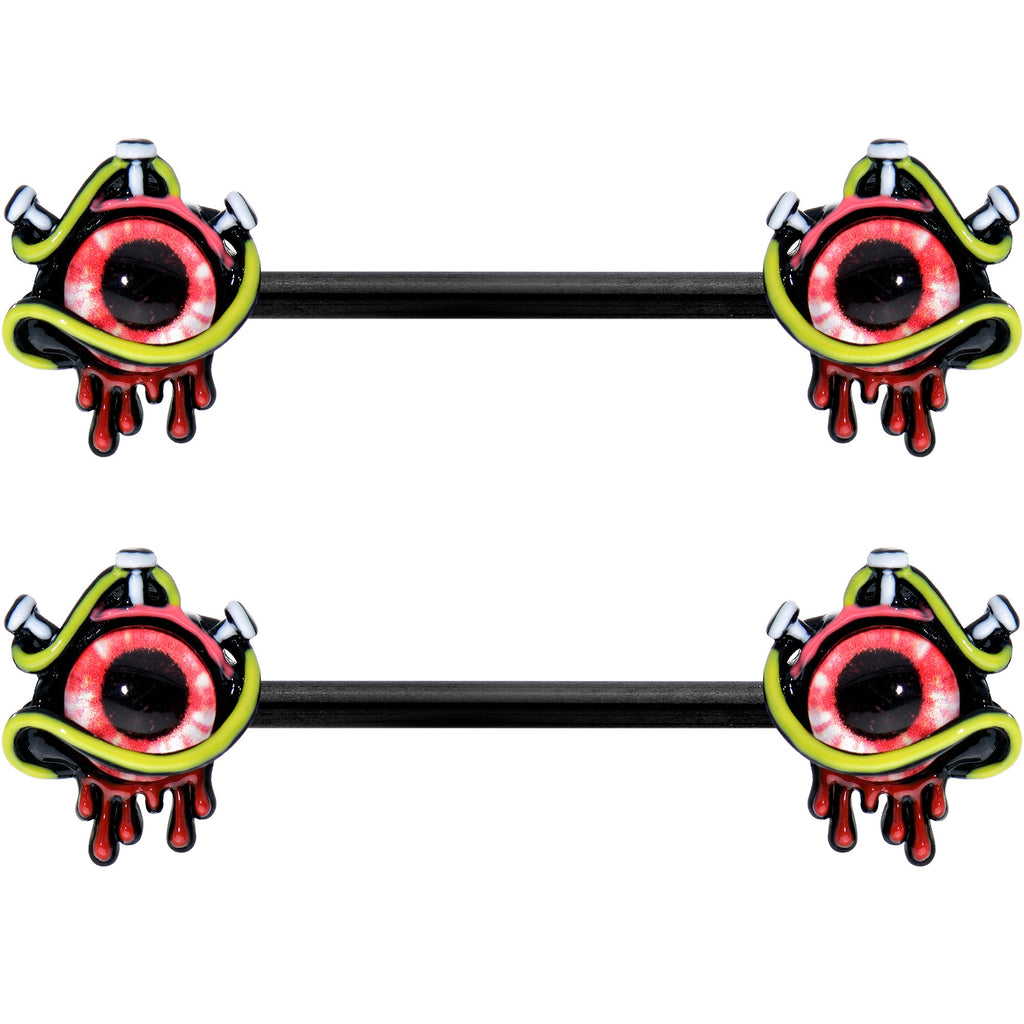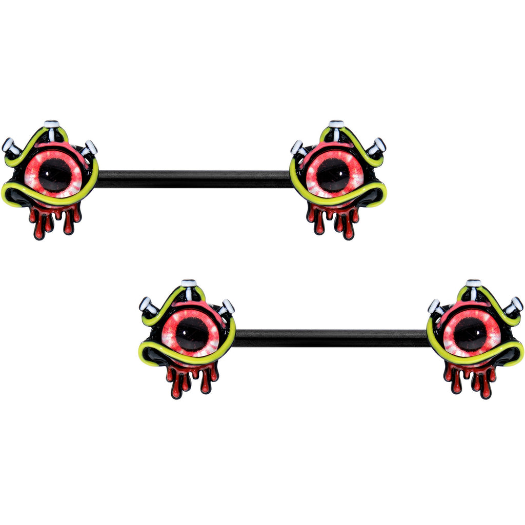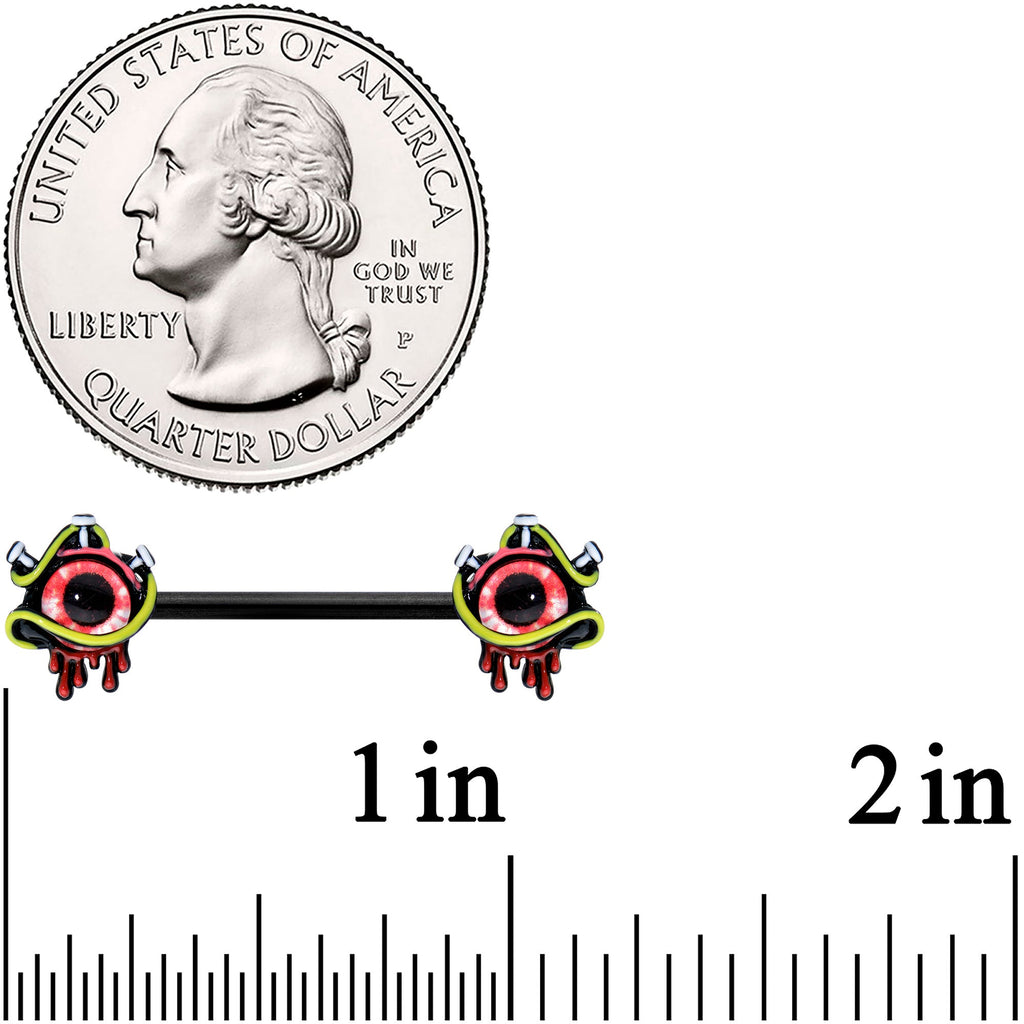 You'll have all eyes on you with this creepy 14 gauge nipple jewelry! It's made with 14mm black PVD over 316L surgical grade stainless steel straight barbells. Each of the ends features an eyeball charm, embellished with yellow detailing and white spike charms coming from the tops. You'll definitely want to keep an eye on these creepy cool Halloween nipple piercing rings! Sold as a set of two.Specifications