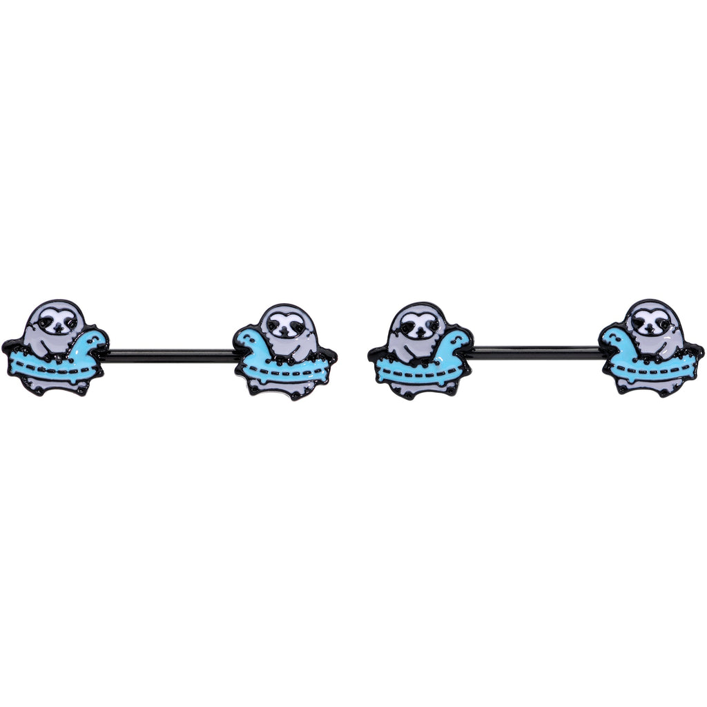 Sloths usually hang out in trees but the onea on this 14 gauge nipple jewelry are off to take a swim! It's made with 14mm black PVD over 316L surgical grade stainless steel straight barbells. The ends each features an adorable grey and black sloth charm, sitting inside a blue pool float, complete with a tiny dinosaur head detail! Take your nipple piercings for a deep dive into adorable with these sweet sloth nipple rings. Sold as a set of two.Specifications