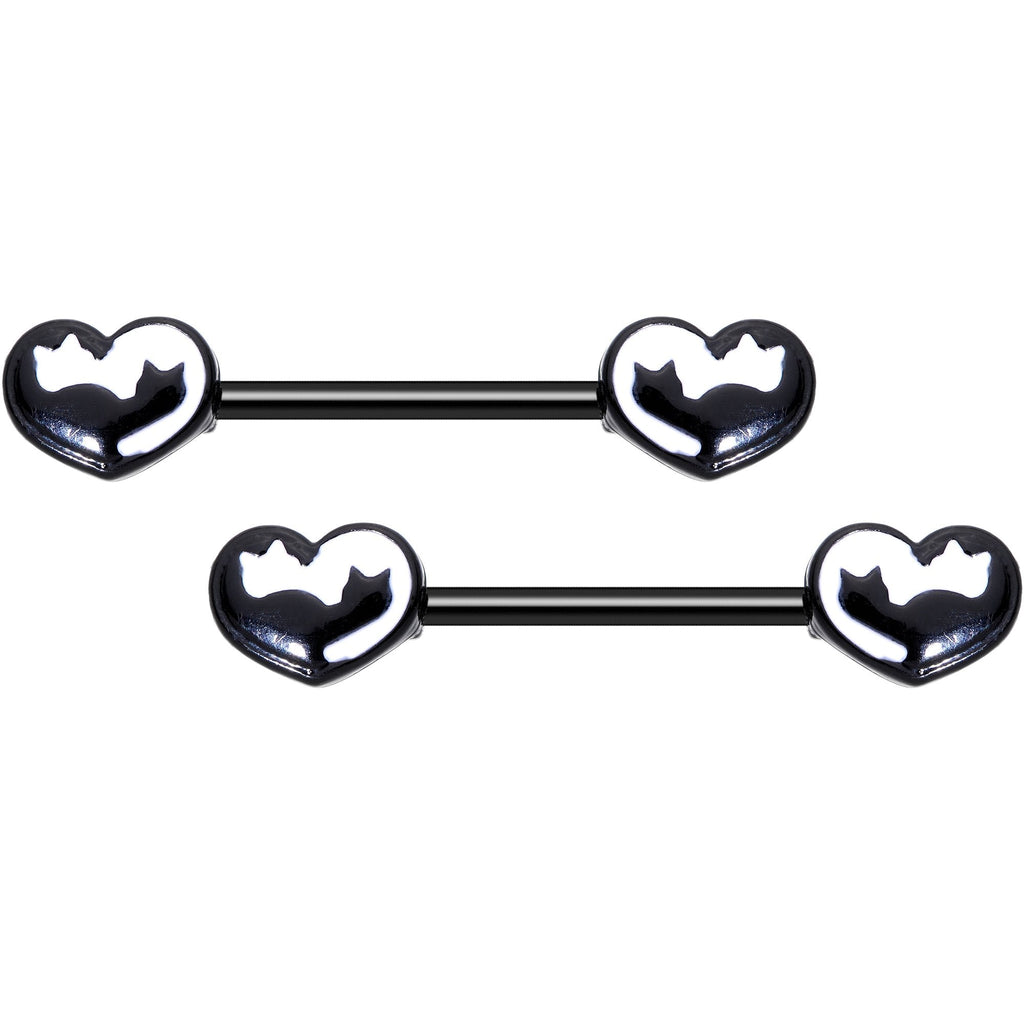 These 14 gauge nipple rings are the cat's meow! Made with black plated over 316L surgical grade stainless steel straight barbells, they feature heart-shaped ends with what appears to be a white color silhouette of a feline in repose. But take a closer look - the space around our feline friend is a mirror image of another relaxing kitty in black, forming a design reminiscent of a traditional Yin-Yang symbol. If you love cats, you need to get your paws on these nipple rings! Sold as a set of two.