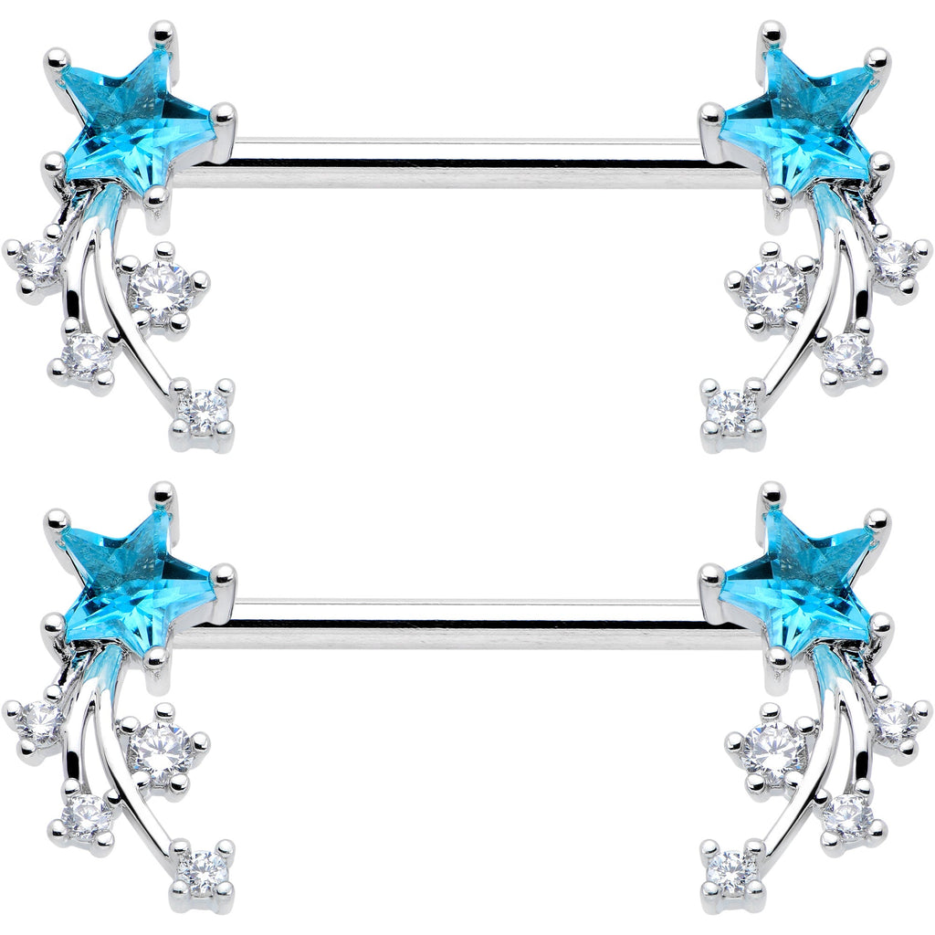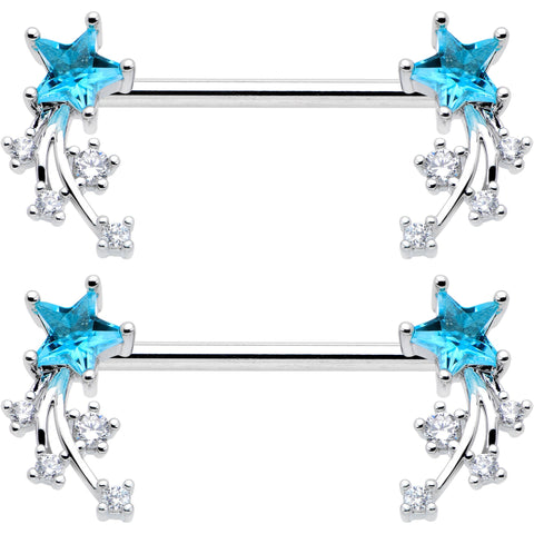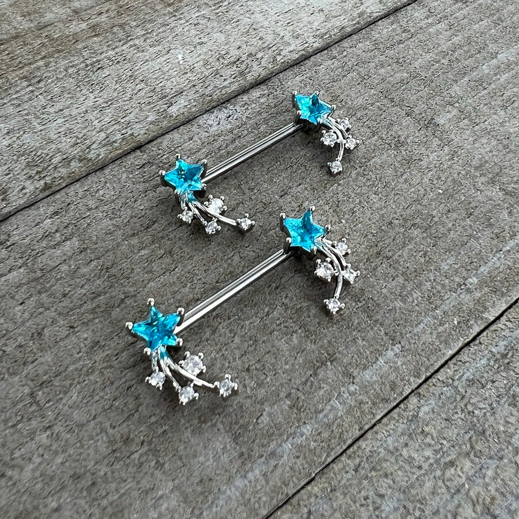 14 Gauge 9/16 Blue Clear CZ Gem Shooting Star Barbell Nipple Ring Set