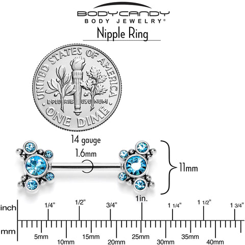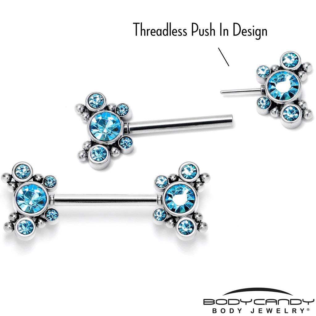 Simple style that goes with everything is what you get with with these 14 gauge nipple rings. They are made with 14mm durable 316L surgical grade stainless steel straight barbells. The ends are set with forward facing blue cubic zirconia gems with a quartet of smaller blue cubic zirconia gems surrounding a larger blue cubic zirconia gem. They feature raised detailing and an threadless design for maximum comfort on insertion and removal while keeping a secure fit. Keep it simple while still keeping it stylish with this eternally elegant nipple piercing jewelry. Sold as a set of two.Specifications