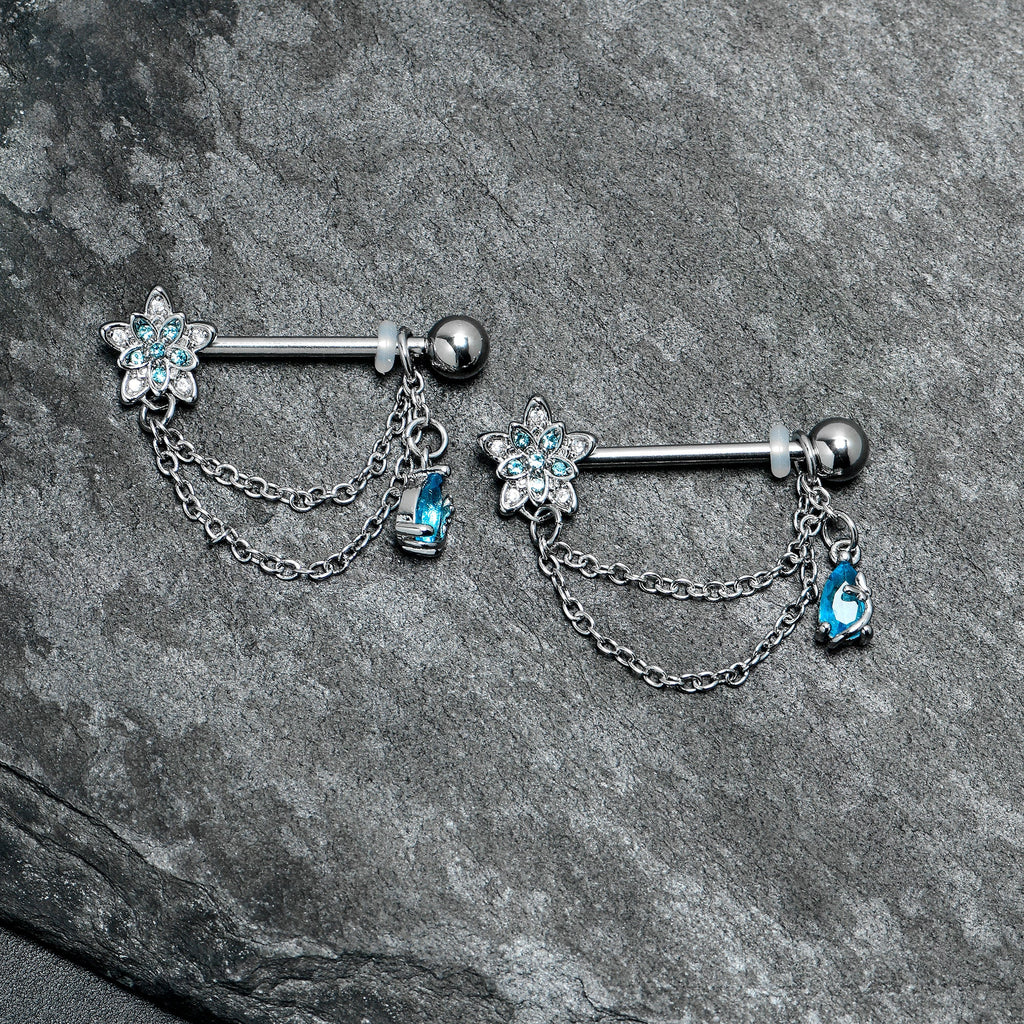 14 Gauge 9/16 Blue CZ Gem Snowflake Flower Chain Dangle Nipple Ring Set