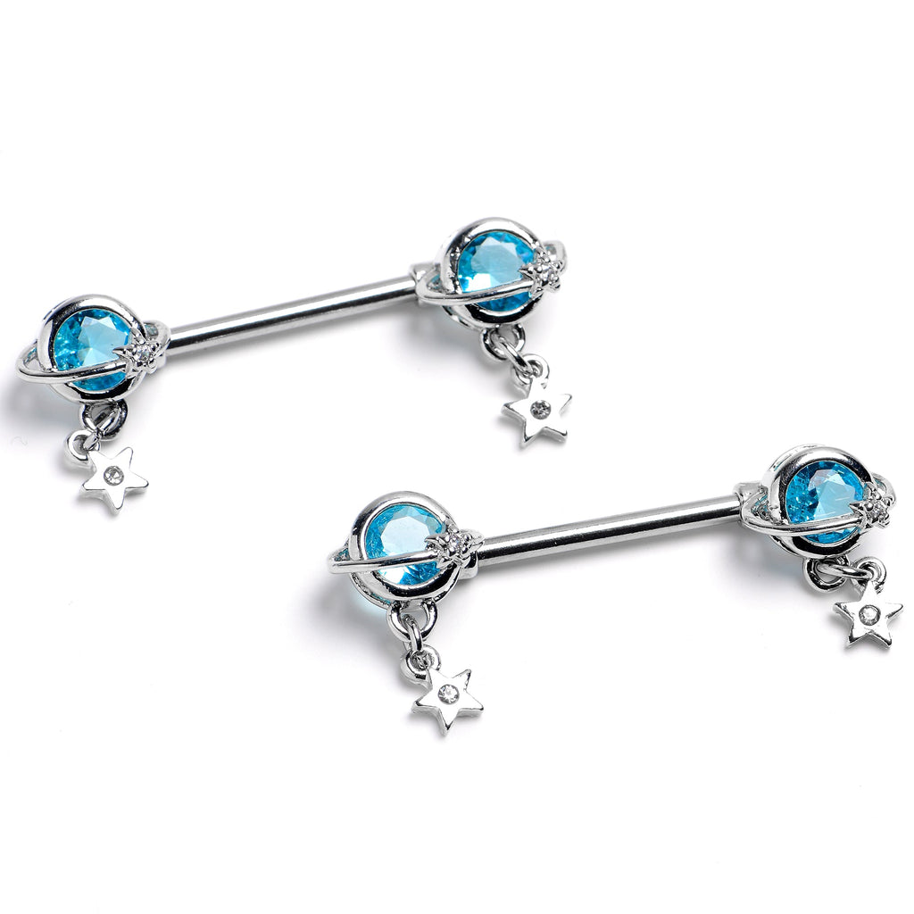 This 14 gauge nipple jewelry is out of this world. It is made with 14mm durable 316L surgical grade stainless steel straight barbells. Each of the ends features the planet Saturn, with the planet composed of a single blue cubic zirconia gem and ring. Beneath each planet dangles a small star charm, set with a clear cubic zirconia gem for an added touch of style. These heavenly bodies are sure to make your nipple piercings into stars with these celestial-themed nipple piercing rings. Sold as a set of two.Specifications