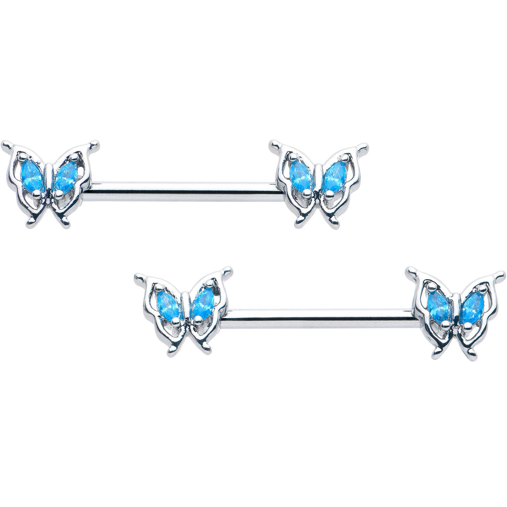 Add some butterfly fabulousness to your look with this 14 gauge nipple jewelry. It is made with 14mm durable 316L surgical grade stainless steel straight barbells. Each of the ends features a butterfly charm, embellished with simple detailing. Their wings are set with blue gems for an added touch of style. Fill your look with fabulous fashion with these lovely butterfly nipple piercing rings. Sold as a set of two.Specifications