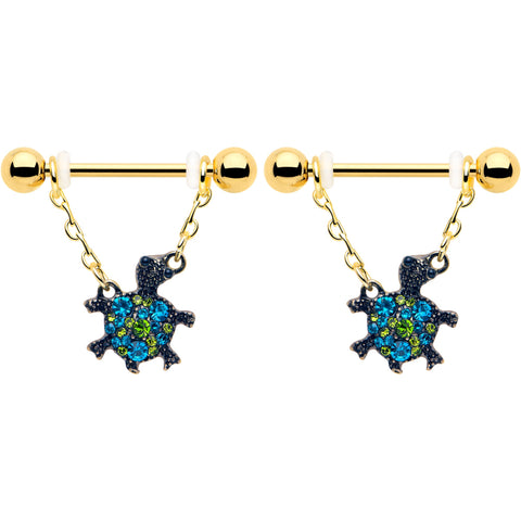 14 Gauge 9/16 Blue Gem Gold Hue Sweet Sea Turtle Dangle Nipple Ring Set