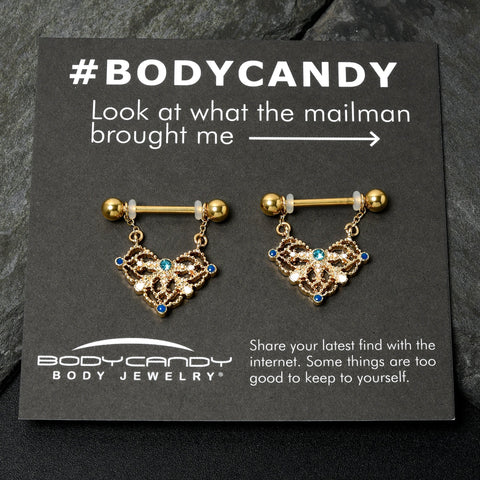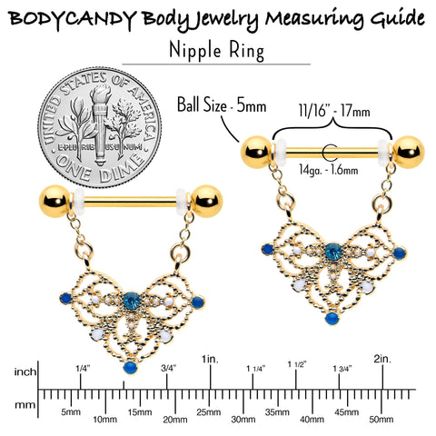 14 Gauge 9/16 Blue Gem Gold Tone Lacy Rhombus Dangle Nipple Ring Set