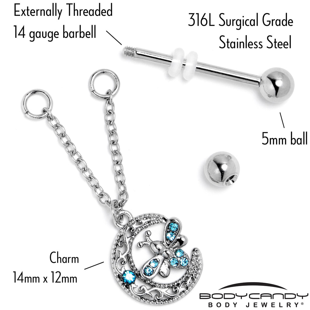 This crescent moon may be alone in the sky but it's got a friend on this 14 gauge nipple jewelry. It is made with 14mm durable 316L surgical grade stainless steel straight barbells with 5mm ball ends. Each barbell supports a matching length of dangling chain. Each chain features a crescent moon charm, embellished with filigree detailing giving them an airy appearance as well as blue gem embellishments. Set between the points of the moons are dragonfly charms, with blue gems in the wings and bodies. You'll want these nipple piercing rings to keep you company forever. Sold as a set of two.Specifications